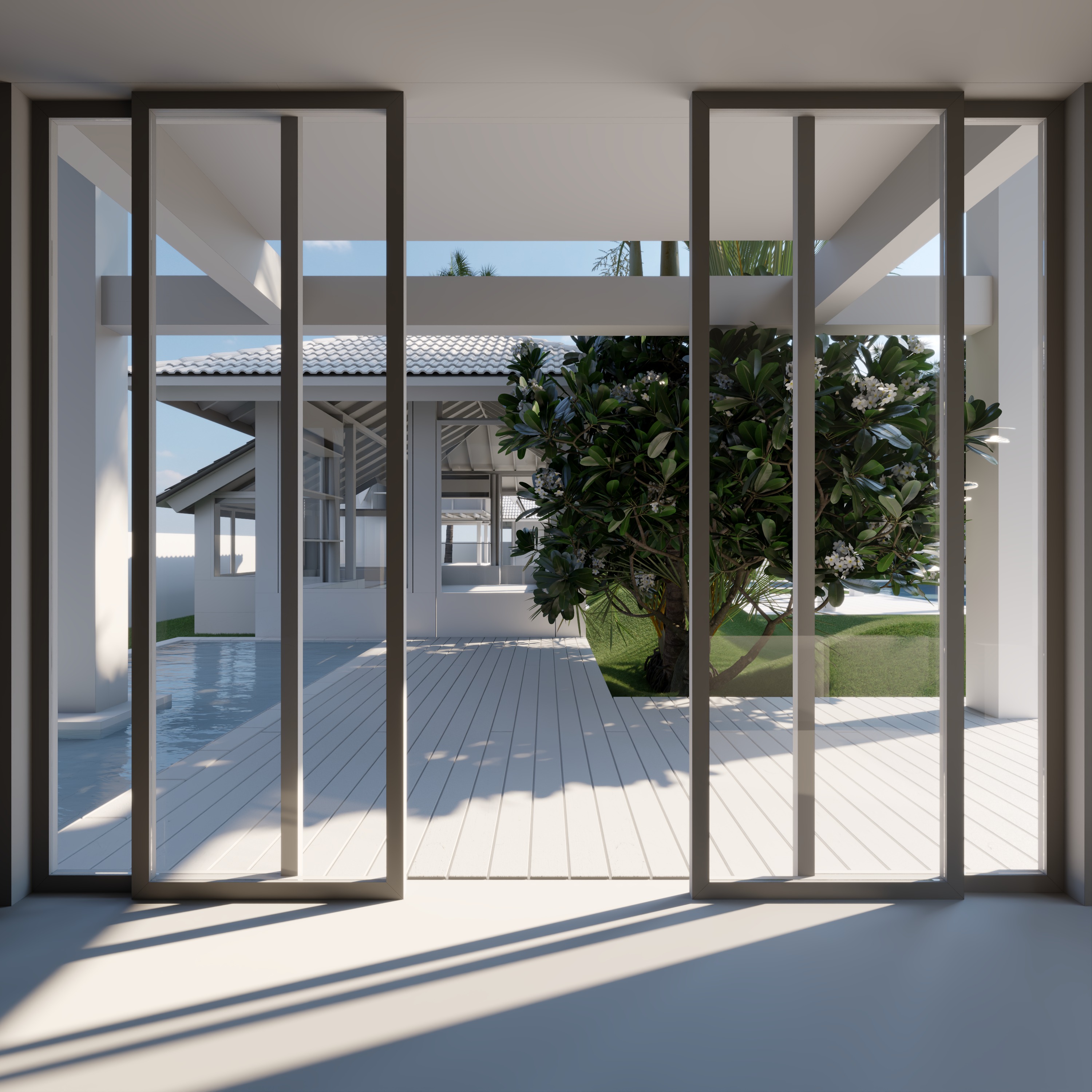preserve the exact architectural form geometry proportions fa ade composition structure and camera angle from the reference image do not modify massing openings framing rhythm roof thickness or interior layout maintain all non landscape elements in pure matte white exactly as shown roof plane beams columns slab frames interior walls cabinetry furniture and fixtures no texture no material variation no color shift uniform crisp white surfaces with soft natural shadow gradients only glass remains fully transparent and neutral landscape arranged as a japanese moss and stone garden integrated with a calm water feature introduce shallow linear reflecting pools and still water planes woven between moss carpets and stone stepping platforms water surface is mirror like subtle and minimal reflecting trees and white architecture without overpowering the composition dense layered moss with organic contours natural stone slabs floating above water edges low shrubs mature trees with filtered green canopy light soft diffused morning atmosphere with gentle sunlight filtering through foliage delicate shadow play across white surfaces high contrast between pristine white architecture and lush green landscape with reflective water accents serene contemplative mood photorealistic rendering ultra detailed vegetation textures cinematic natural lighting balanced exposure