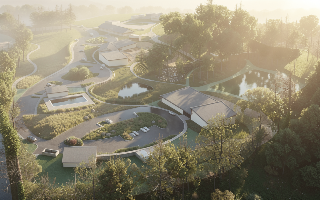 8k photorealistic image while keeping textures the same as selection professional landscaping in a lightly wooded scene materials all dark gray with wood column