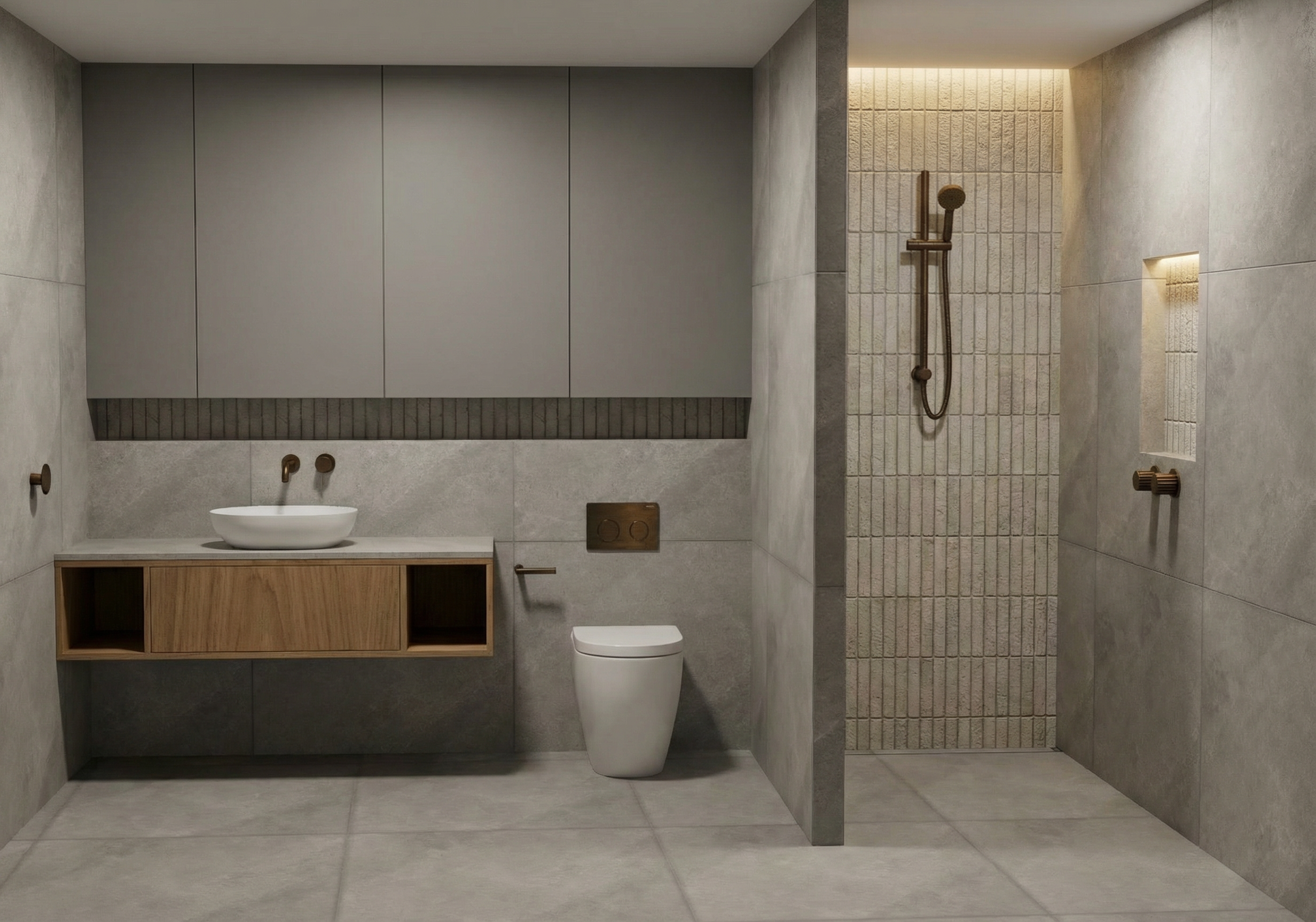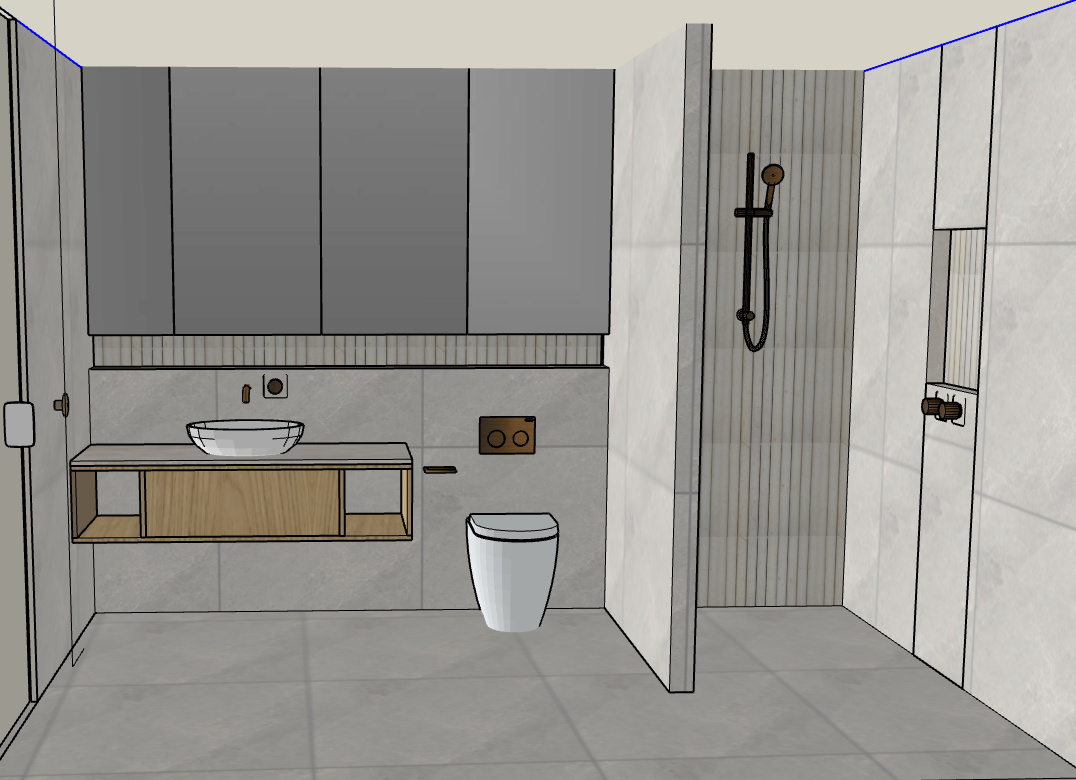back shower wall and niche to be limestone finger tiles led light under mirror
