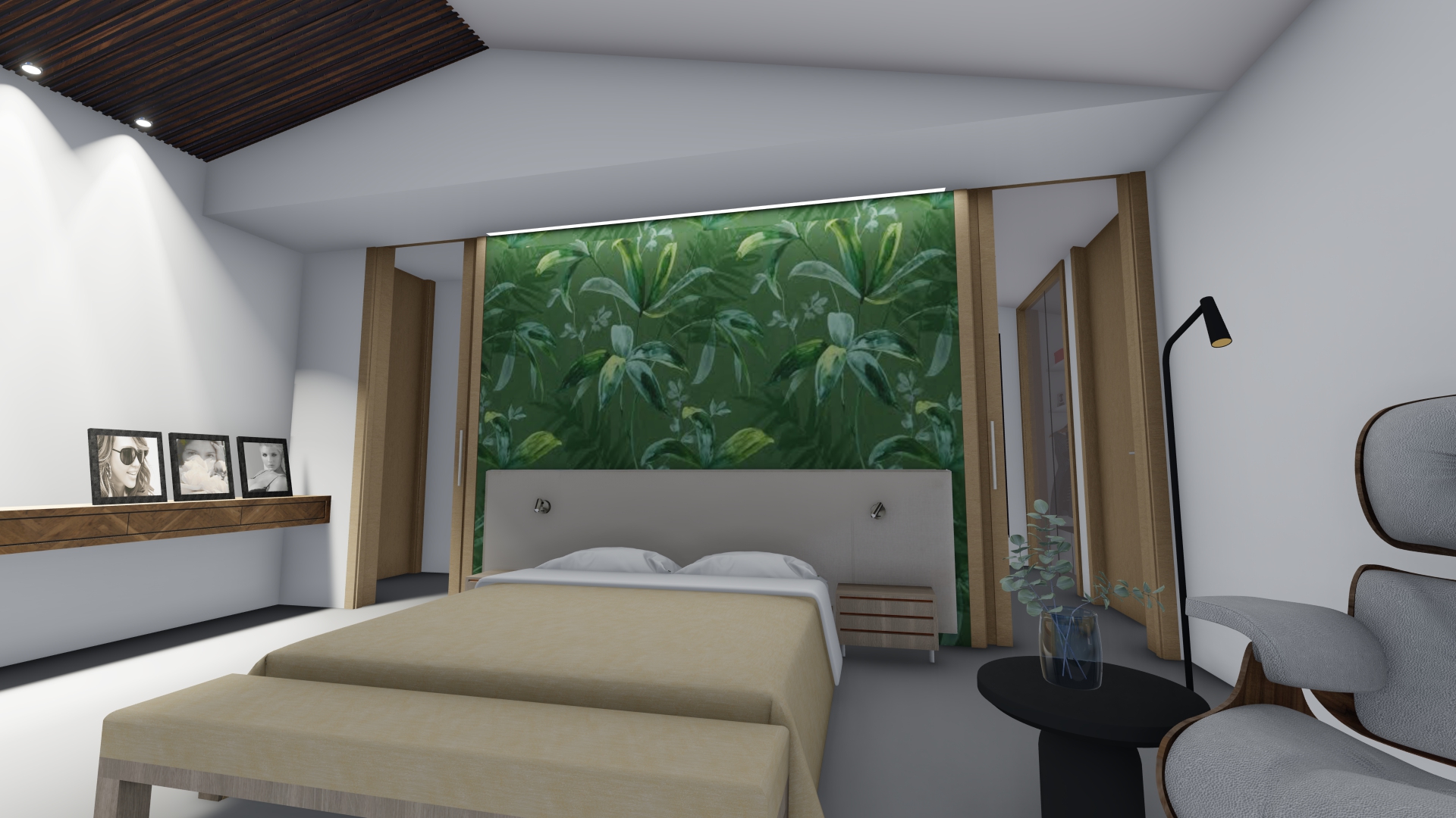 quiero que la pared del cabecero sea un papel pintado en tonos verdes quiero que el techo de madera sea m s claro y que mejores la iluminacion de la habitacion