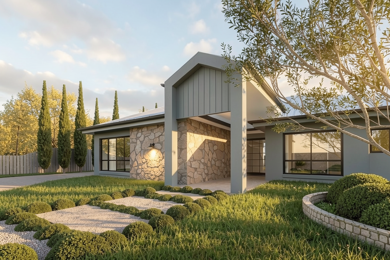 exterior shot organic modern living room with black windows and level 4 drywall finish