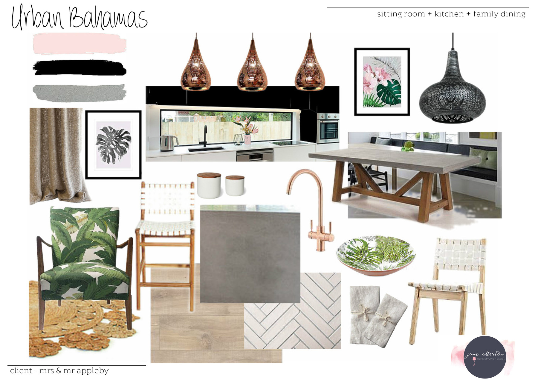 a large tropical style family kitchen with brass finishes polished concrete benchtops herringbone tiles and palm print fabrics and wall art