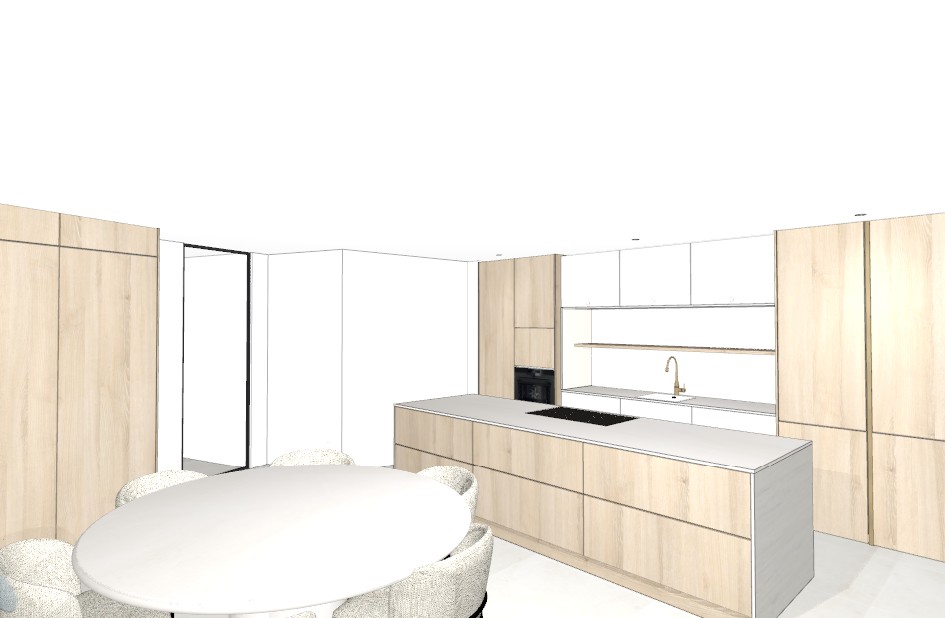 a scandinavian kitchen with light oak combined with warm white and a walk through door to the hallway in black framing