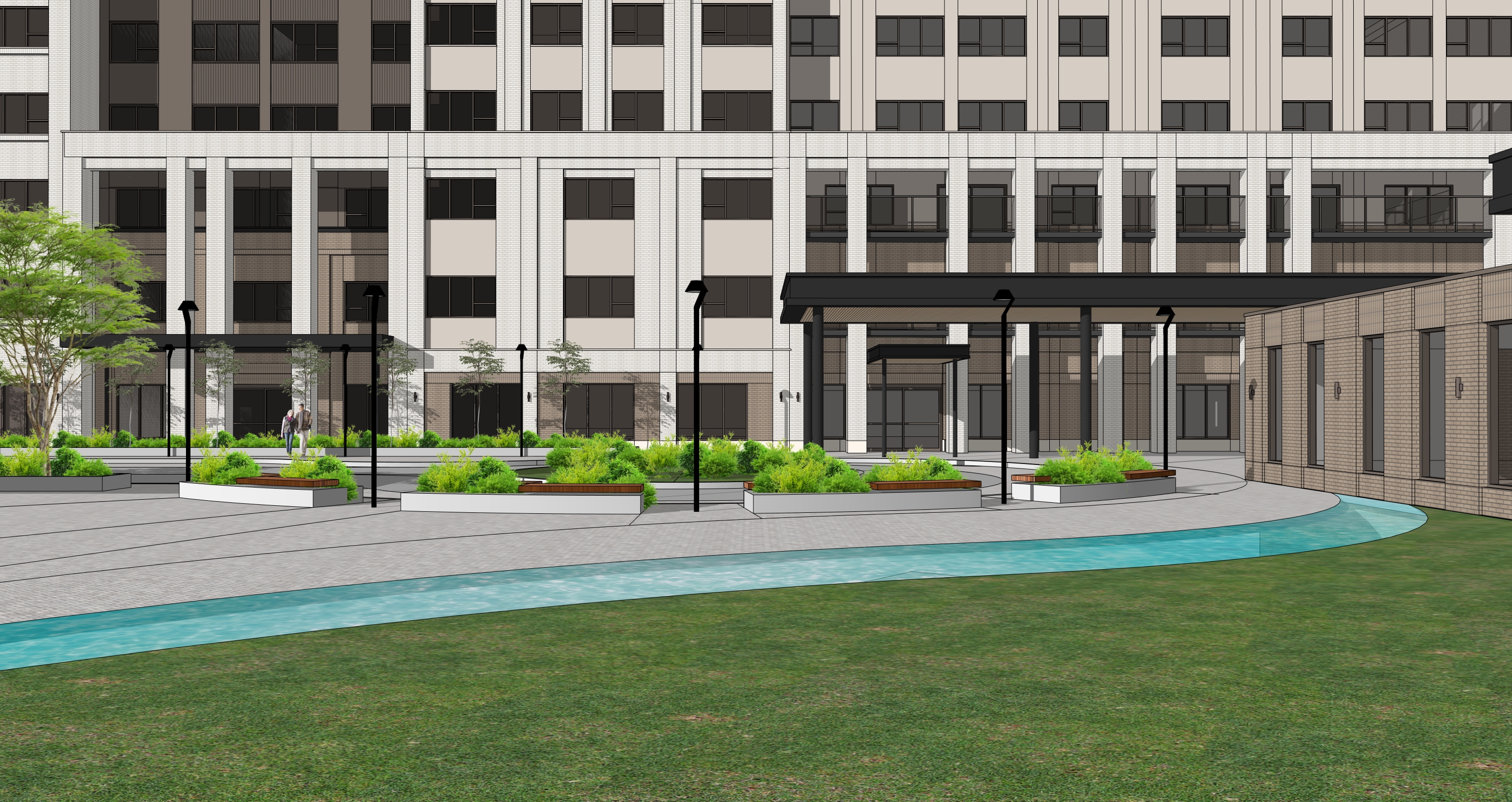 daytime render of a courtyard in front of a very light beige and brown brick building the curved shape in the foreground is a water feature with plants and rocks in the foreground add people