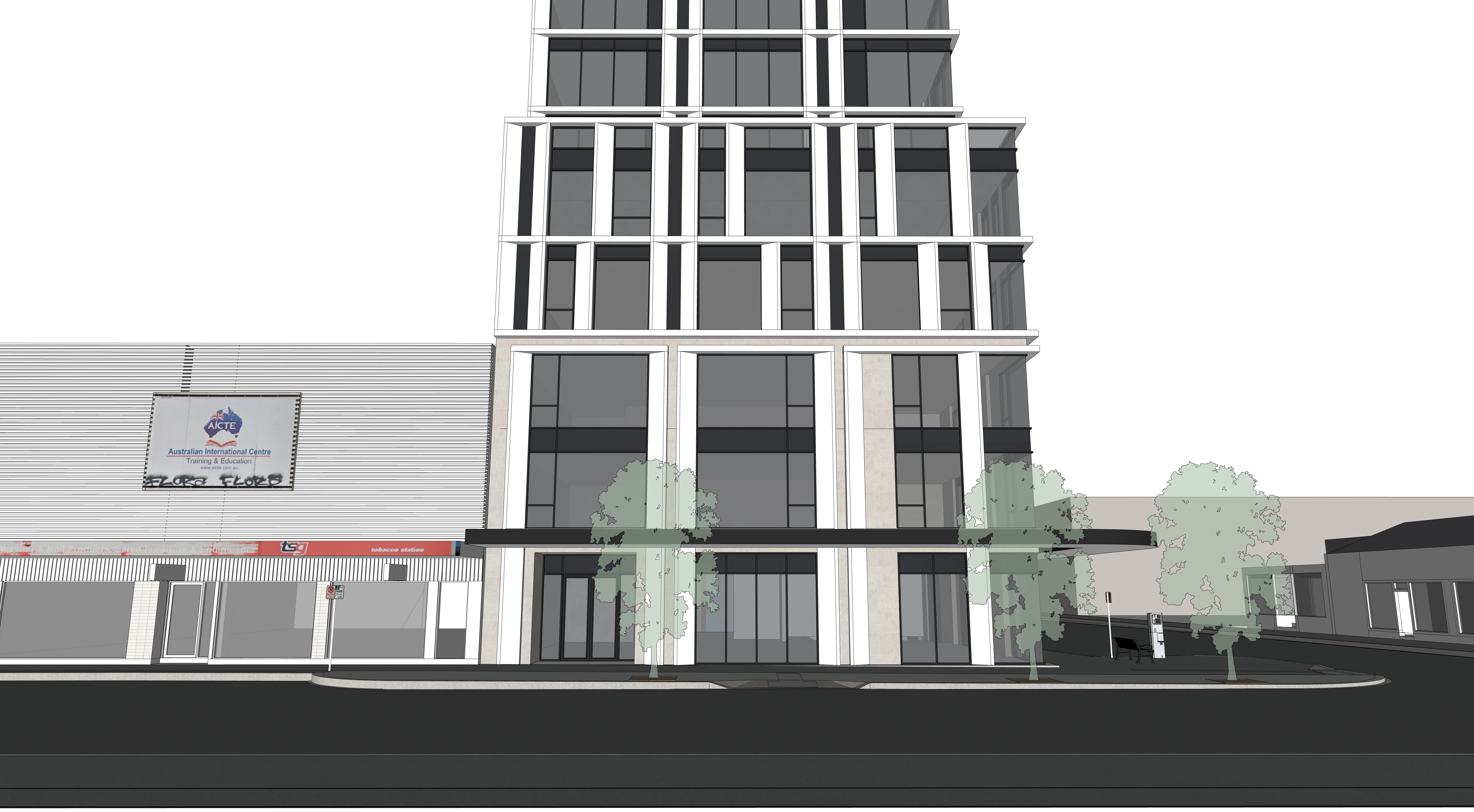 contemporary service apartment building with curtain wall glazing off white frame cladding ivory wall with black tinted glass color on facade people walking outside in the afternoon