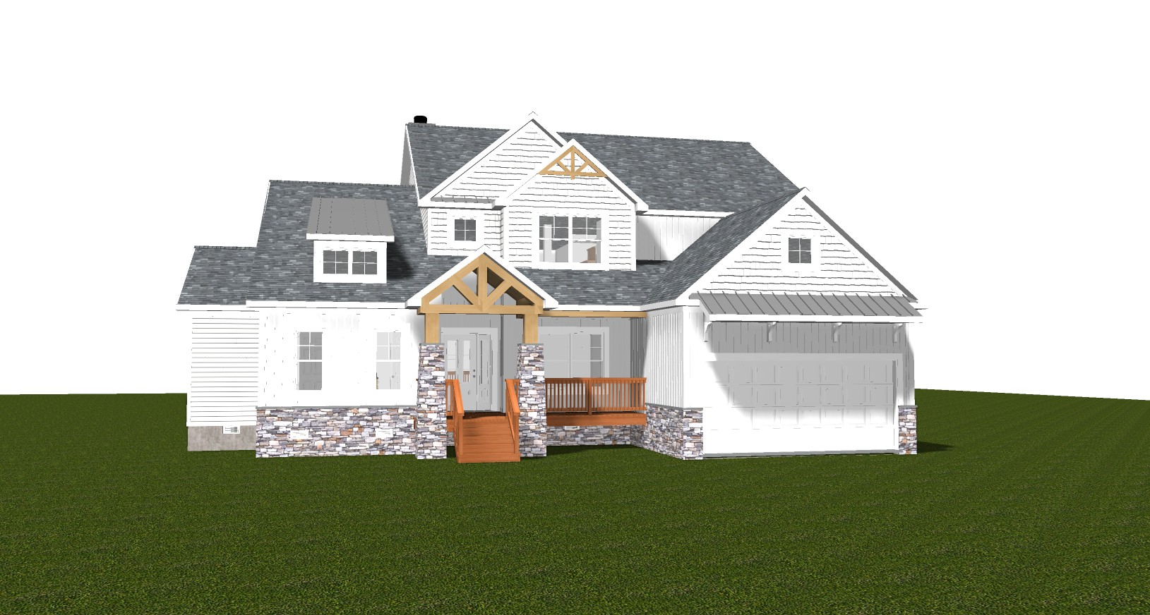 make this front elevation photorealistic while keeping textures and architectural elements the same as selection add professional landscaping on a lightly wooded scene with good lighting that is in highlands north carolina use the following colors and materials board and batten siding to be c7c8ca in color shake siding to be c7c8ca in color lap siding to be c7c8ca in color corner boards to be c7c8ca in color siding trim to be white in color stone veneer to be ceniza made of coarse grained glacier worn striated stones large and small slabs intermingle for a cobbled look and multi textured rugged surfaces create striking shadow lines shingle roofs are to be certainteed dimensional shingles in pewter standing seam metal are to be charcoal in color windows to be white in color mutins in top window sash only window trim to be white in color entry door to be stained ebony glass 6 lite door entry door sidelite to be stained ebony glass 3 lite sidelite entry door trim to be white in color raised panel garage door to be white in color fascia to be white in color soffit to be white in color eaves to be white in color gutters and downspouts to be white in color columns to be stained ebony deck to be stained ebony handrail to be stained ebony queen truss open gable at porch to be stained ebony porch soffit to be stained ebony gable brackets at garage rood to be stained ebony gable accent queen truss with king projection to be stained ebony exterior lantern wall fixtures at each side of the garage to be matte black foundation to be poured wall concrete