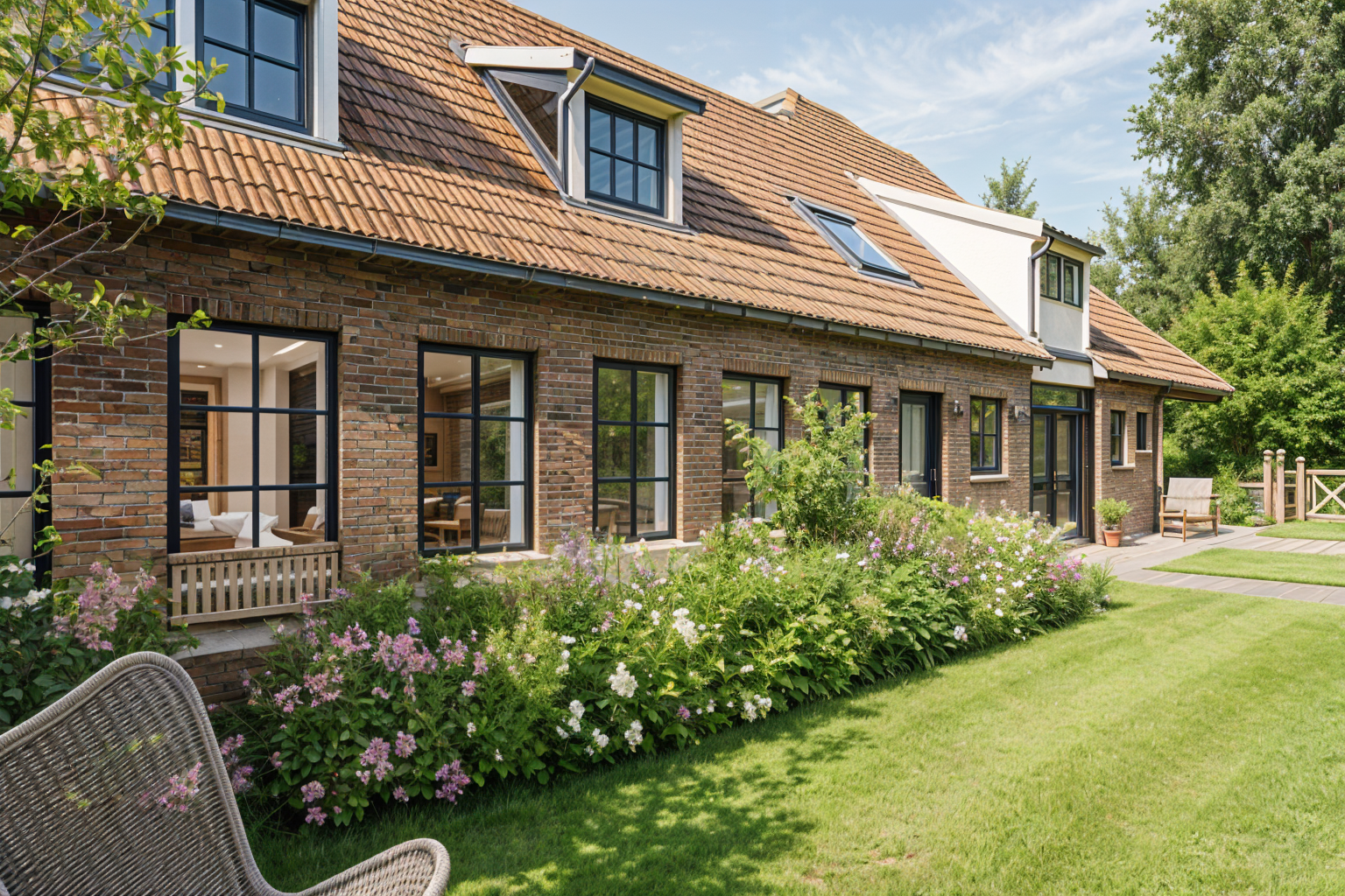 make this photo more realistic don t change any geometry update the herringbone pattern on the cabinetry to fluted door fronts in a medium grain use a grey steel faucet update the range to stainless steal add a 6 feet x3 feet island with fluted wood and waterfall countertop plus 3 skylights above it update the countertop and backsplash halfway up the wall to a white and gray ceasarstone use a grey color from benjamin moore for the rest of the walls add in a fridge to the west wall at the end of the counter run on the south side make the 3 square skylights above the island 1 foot on each side add 3 minimalist knoll style counter stools in tan leather and charcoal black metal legs that have a round back edge add in a roman shade over the window in an black and white mainly black small medium geometric pattern add a hapa teenage boy with black hair and brown skin doing his homework at the island wearing sweats and a blue teeshirt with his back to us add a large low porcelain fruit bowl onto the island have the cabinets run to the end of each wall make the back door a raise panel door in swiss coffee from benjamin moore add a white cast iron pot to the stove add some blue and white asian style dish towels near the sink add a japandi vibe to the scene add a black and white doormat in front of the back door that has an abstract botanical japanese pattern on it make the hood a white color paint the ceiling the same color as the walls add a cute small japanese dog on a nice flat woven grey white textured runner rug in between the island and the sink add the light oak wooden built in desk next to the back door
