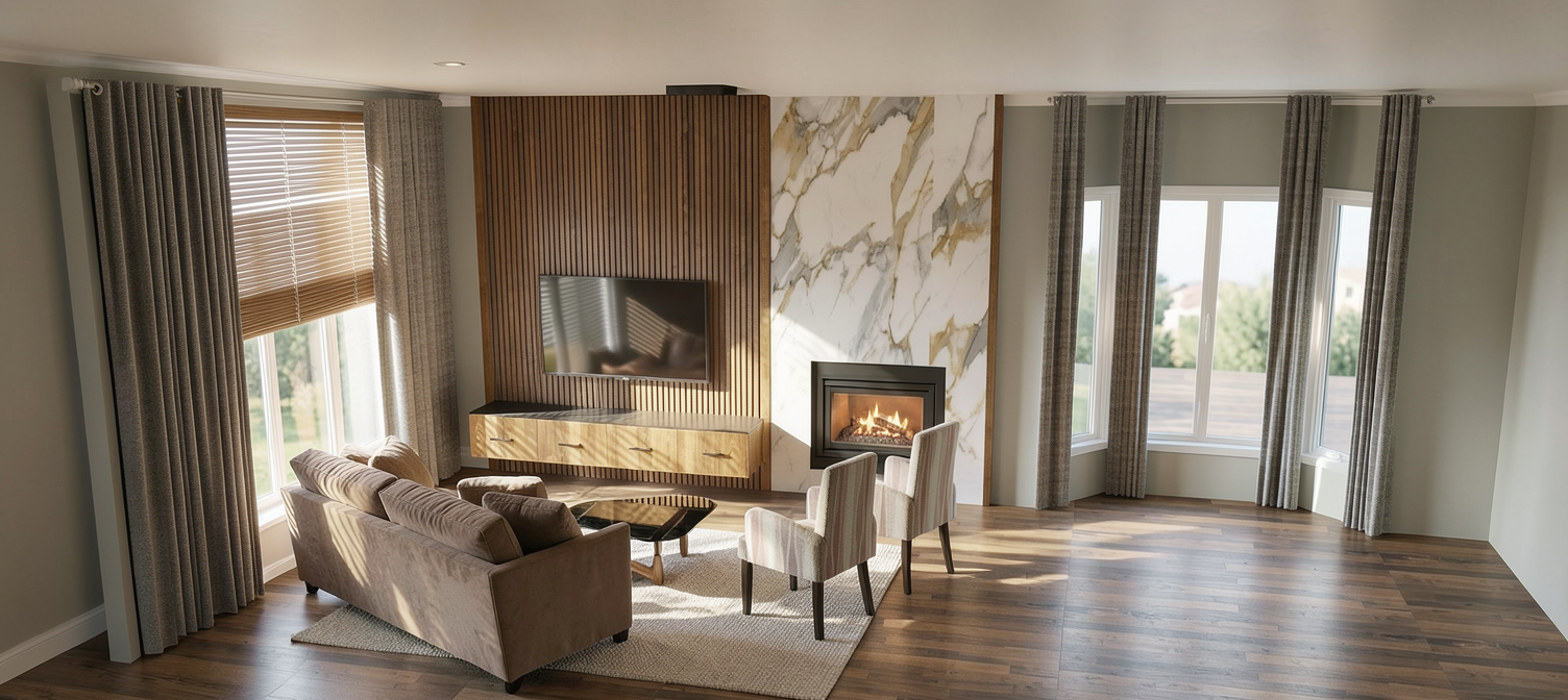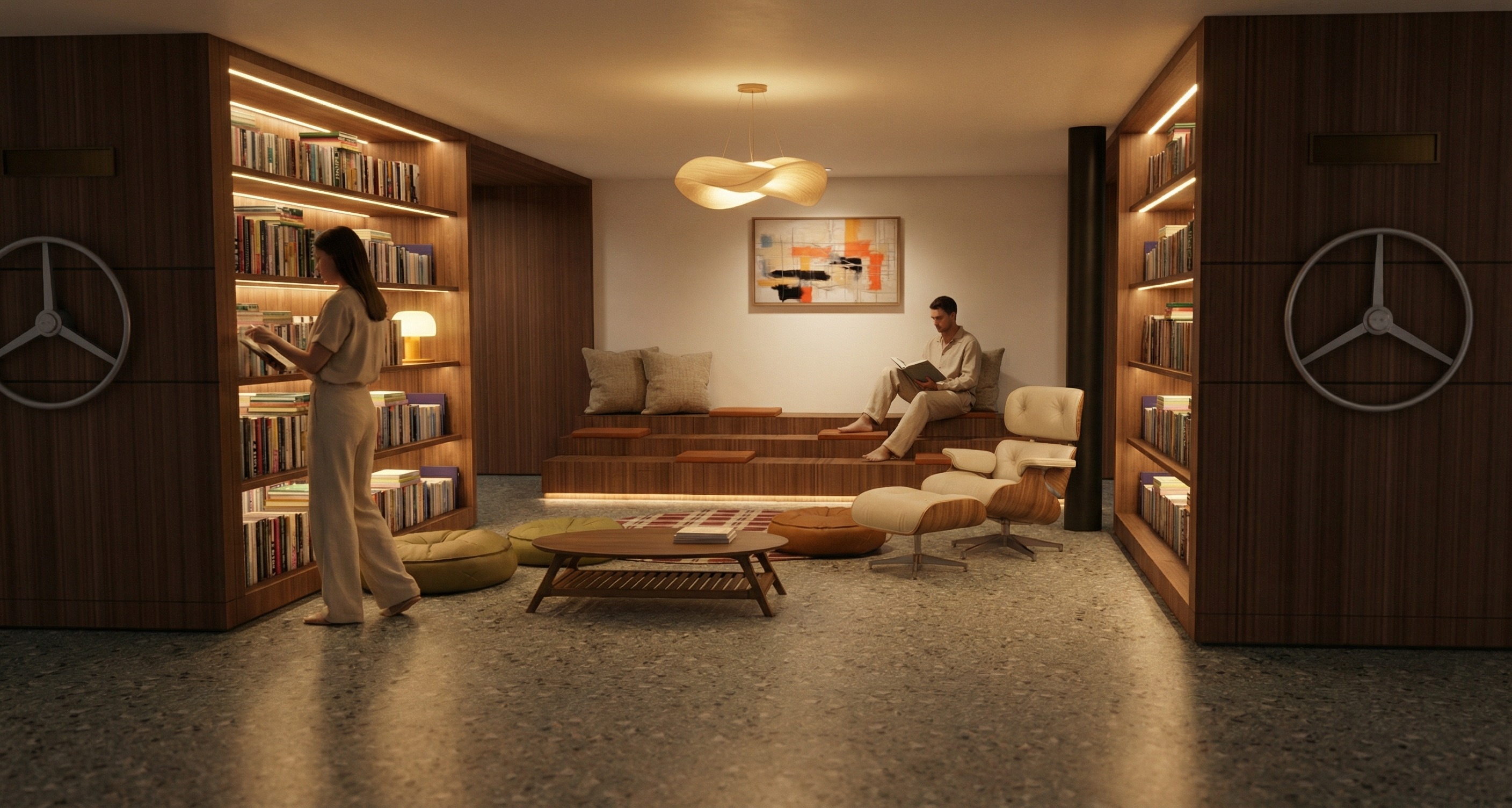 remove the central hanging pendant lamp from the scene keep the ceiling clean and continuous with no visible fixtures maintain the existing warm ambient lighting coming from integrated bookshelf lighting and indirect architectural lighting preserve the overall lighting atmosphere soft warm indirect illumination realistic shadows and material appearance do not add any new ceiling light fixture photorealistic architectural interior seamless ceiling surface no pendant lamp no hanging object clean architectural geometry