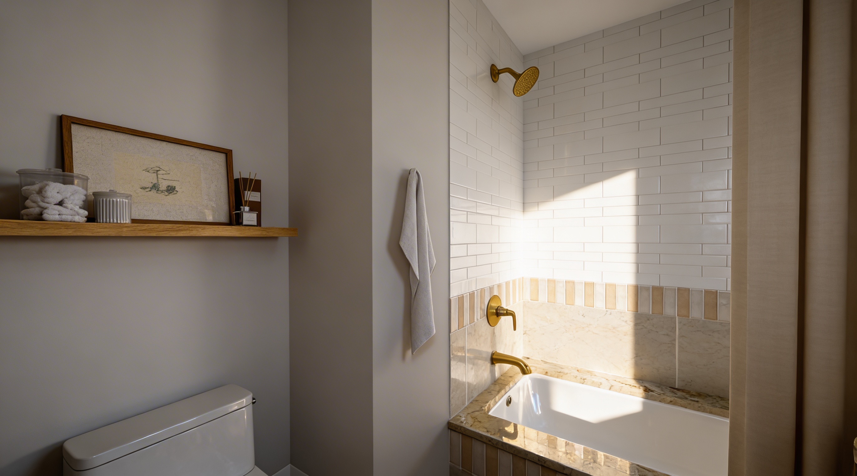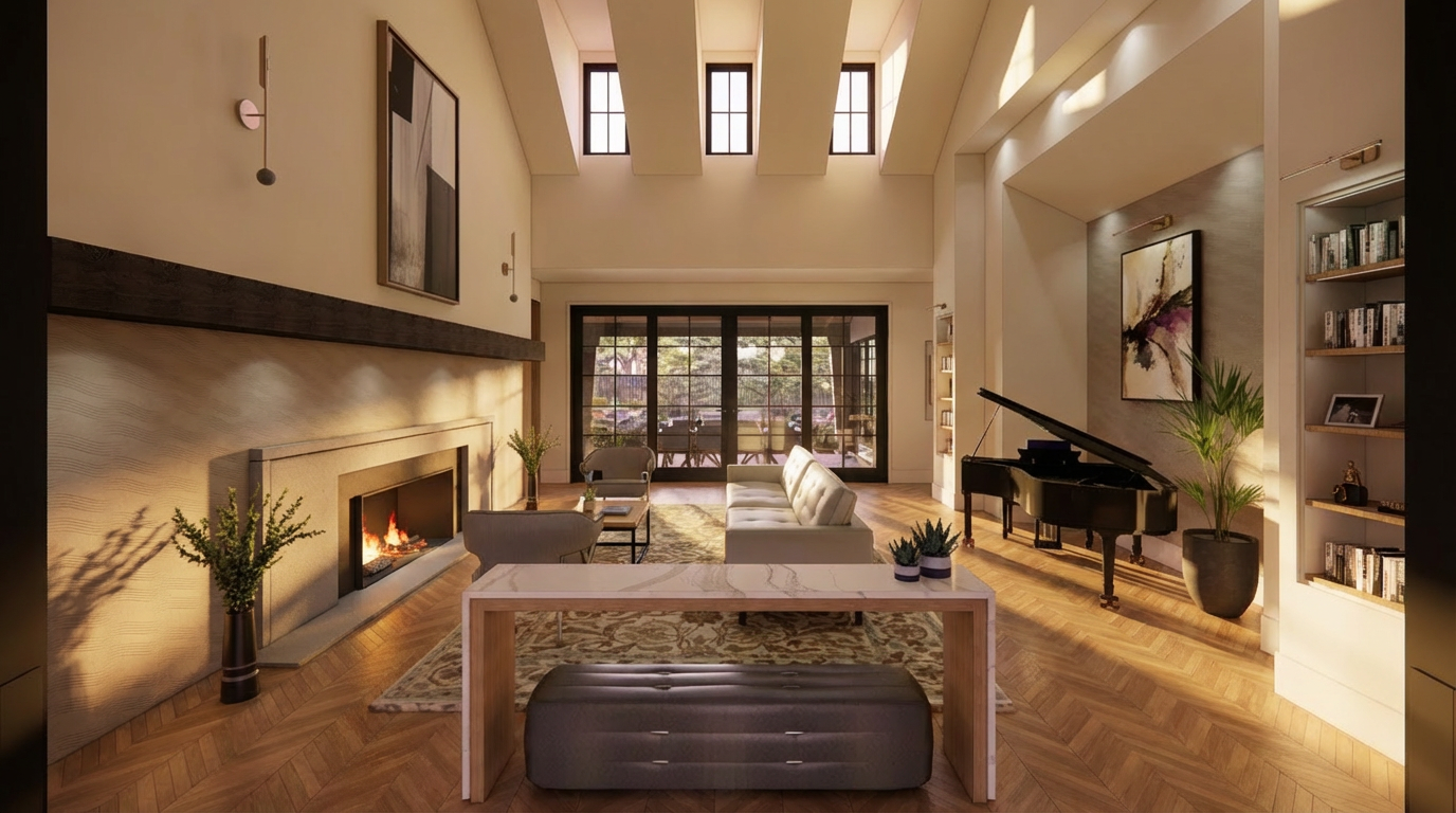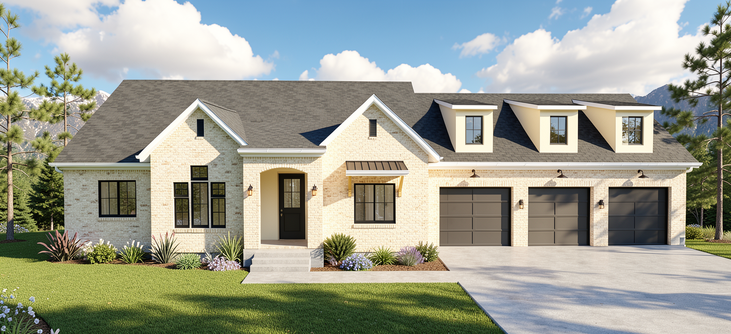 a charming soft creamy house and beige brick accents a soft cream color for the stucco areas a black roof with metal roofs on dormers black garage doors bronze exterior lights a manicured lawn with native plants a soft blue sky with white clouds that softens the sun pine trees scattered behind with mountains behind