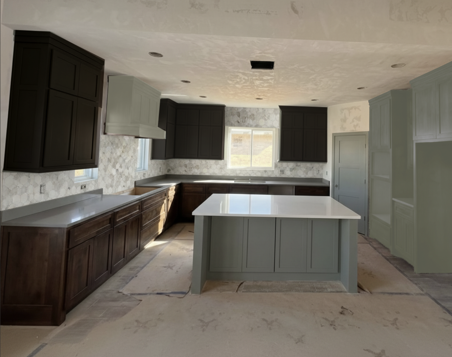 stain the cabinet a dark walnut and make the grey countertops darker with no grey small backsplash keep the green paint the same keep white countetop on island