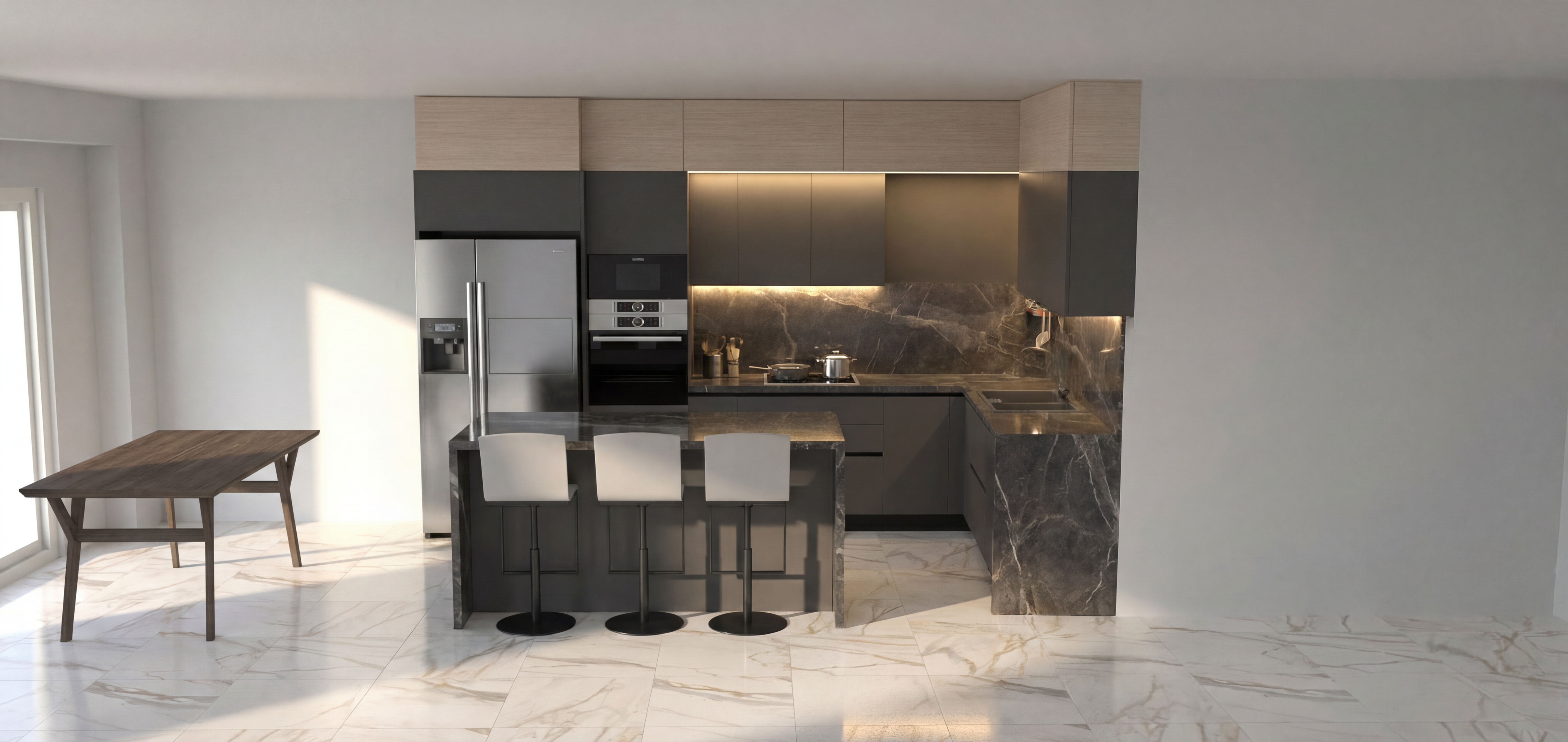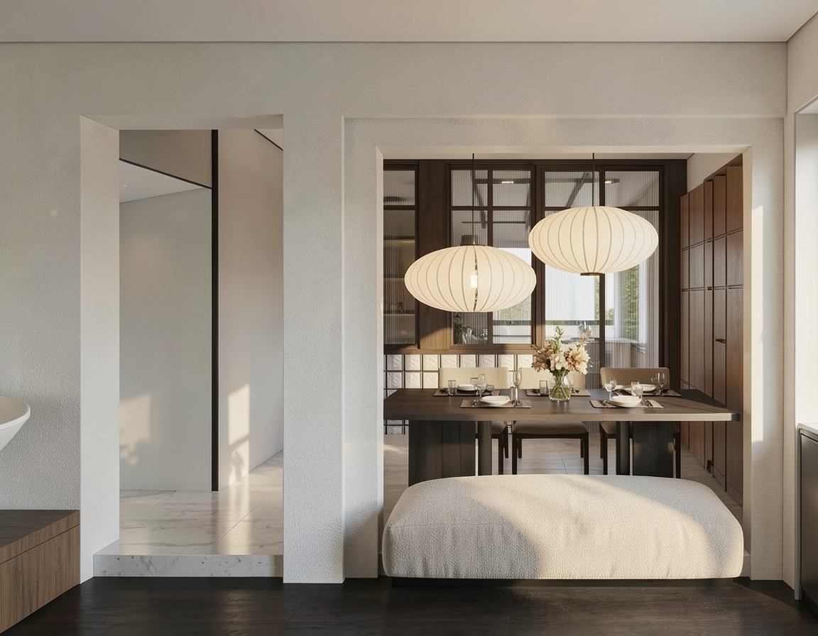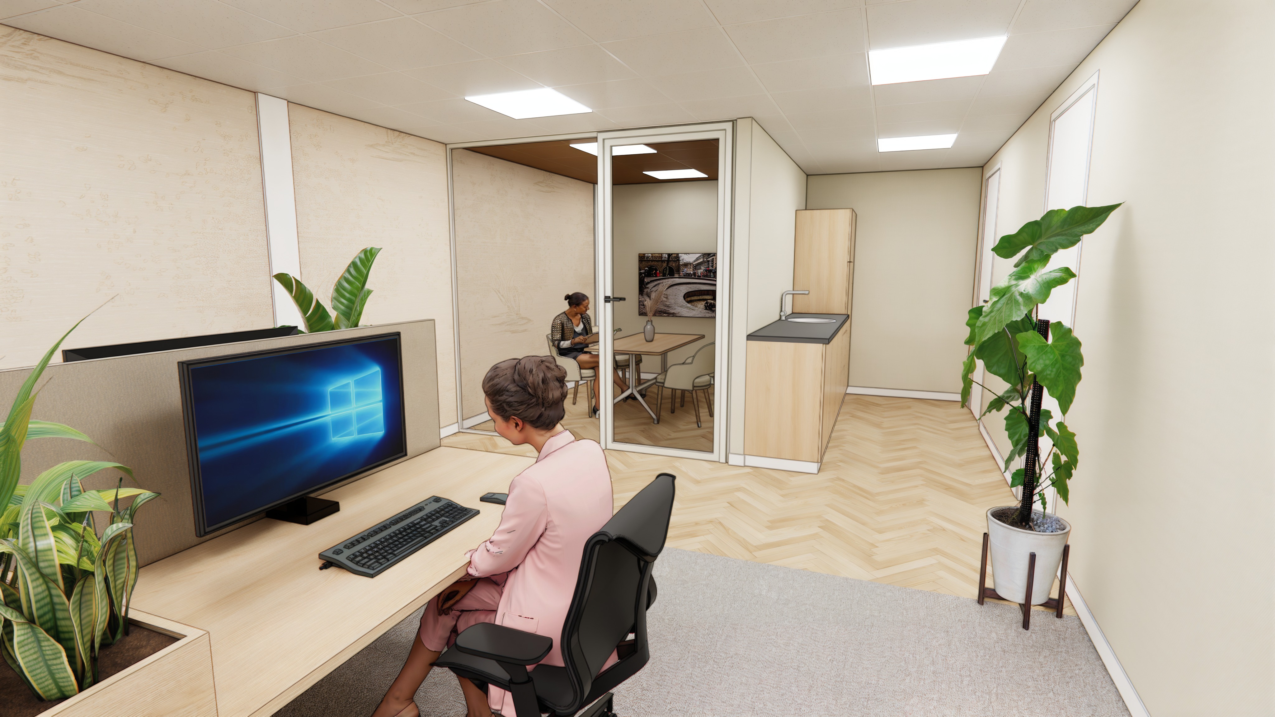 photorealistic interior office space private workstation in foreground with light oak desk large widescreen monitor with keyboard ergonomic black office chair professional woman in pink blazer working at desk viewed from behind acoustic desk divider panels on left side built in planter with lush green tropical plants along left wall herringbone light oak parquet flooring in central corridor light grey carpet tile at workstation small glass walled meeting pod in background with sliding door two people in meeting visible through glass wall mounted screen inside meeting pod round meeting table with chairs compact kitchenette on right side with light oak cabinet doors dark stone countertop integrated sink with chrome tap large fiddle leaf fig plant in white pot with wooden stand beige textured wall panels with white trim recessed led ceiling panels warm neutral tones throughout calm and professional atmosphere coffee mug and notebook on desk phone and small personal items on workstation surface architectural interior photography shot on canon eos r5 24mm lens slight depth of field subtle film grain physically based rendering ultra sharp details 8k resolution award winning interior design photography