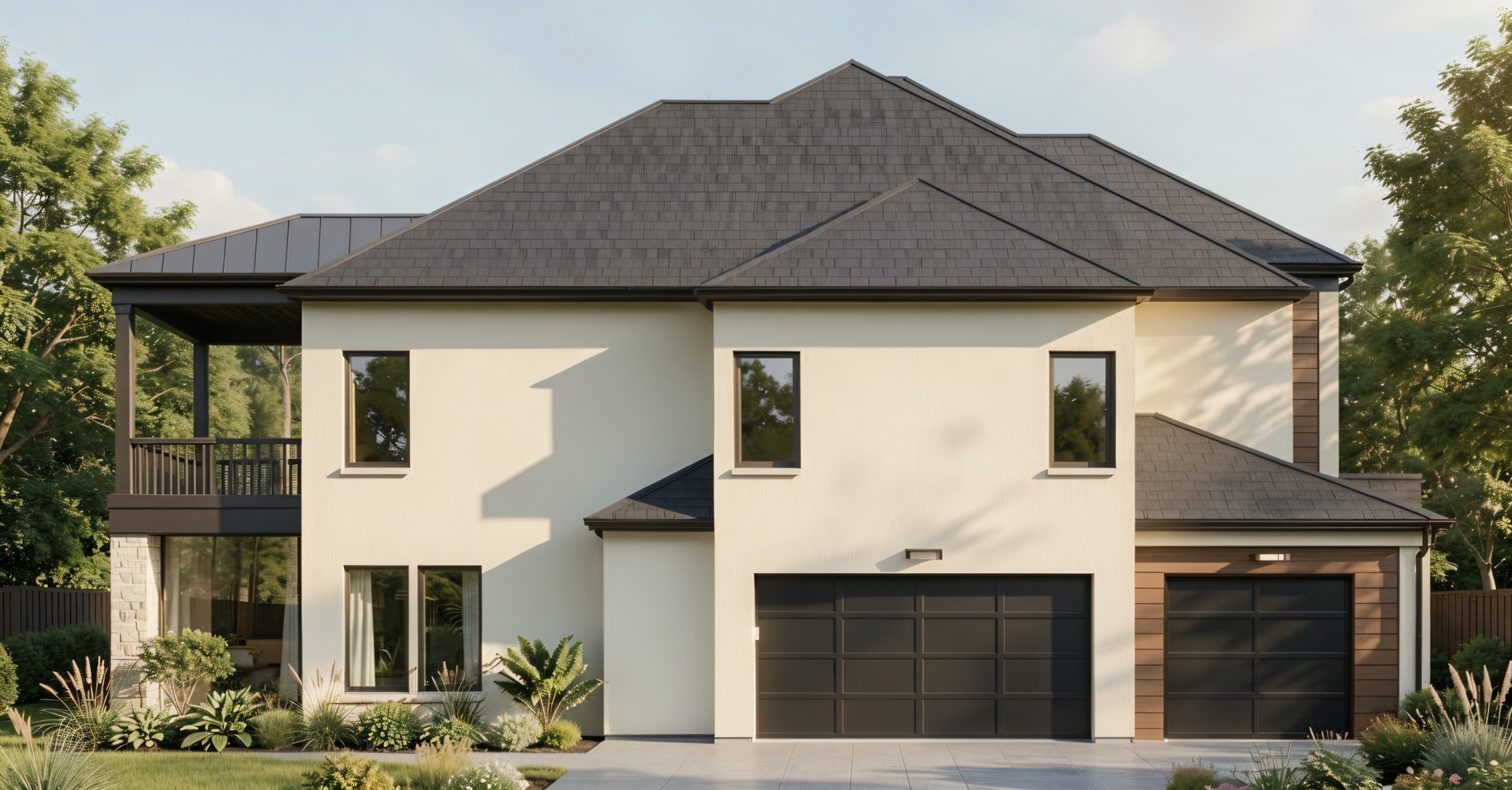 do not move any windows doors or rooflines do not change any colors materials or finishes make the roof shingles black and dark grey and leave everything else exactly the way it is now