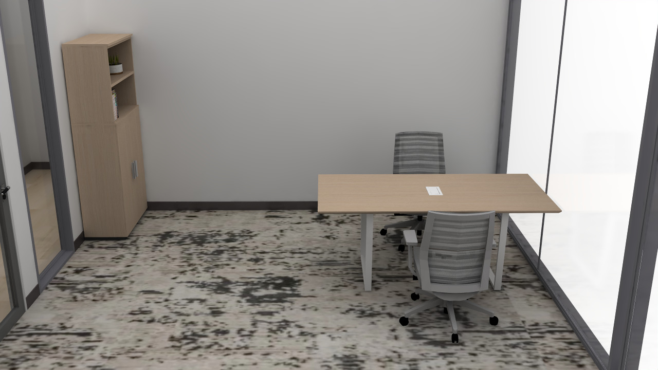 please add dallas skyline outside the window add 2 people working in here do not change furniture or flooring