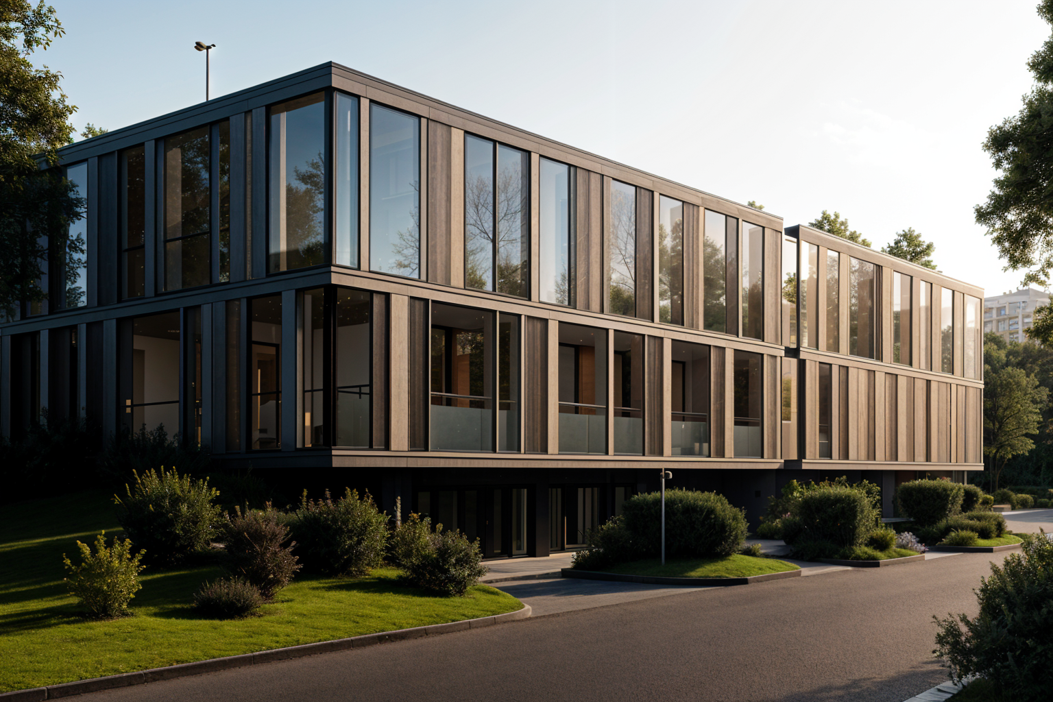 nie zmieniaj proporcji kszta tu ani kadru budynku uk ad bry y elewacji okien i detali architektonicznych musi pozosta identyczny jak w projekcie wykonaj ultra fotorealistyczn wizualizacj architektoniczn w jako ci zdj cia z magazynu o architekturze premium styl fotograficzny profesjonalna fotografia architektury obiektyw 35 mm tilt shift iso 100 przys ona f 8 pe na g bia ostro ci neutralna ekspozycja balans bieli naturalny kolory realistyczne i filmowe wiat o i atmosfera poranek lub p ne popo udnie z ota godzina ciep e mi kkie wiat o dzienne 3700 4200 k d ugie realistyczne cienie podkre laj ce rytm pionowych lameli subtelna mgie ka powietrzna haze i lekka dyfrakcja wiat a brak prze wietle zr wnowa ony kontrast delikatne odbicia w szybach i b yszcz cych powierzchniach materia y i detale autentyczne materia y tynk mineralny o mikrostrukturze drewno elewacyjne o r norodnym us ojeniu i odcieniach szk o z realistycznymi odbiciami metal satynowany drobne nieregularno ci powierzchni subtelne zabrudzenia delikatne cienie kraw dziowe i zr nicowanie koloru lameli widoczne po czenia konstrukcyjne lekka patyna na metalu i szkleniach otoczenie i kontekst naturalna ziele trawniki krzewy byliny i drzewa w tle z realistyczn faktur li ci i p przezroczysto ci niskie nasadzenia przy budynku lekko wilgotna ziemia w cieniu na podje dzie kostka betonowa z realistyczn faktur mikrop kni cia r nice odcieni delikatne odbicia subtelne o wietlenie led w ogrodzie i pod lamelami w dalszym tle dyskretne sylwetki ludzi zaparkowany samoch d cie ruchu lekko rozmyty by zachowa fokus na budynku ton i kolorystyka styl filmowy zr wnowa ony balans ciep ych i ch odnych ton w teal orange delikatne refleksy s oneczne na kraw dziach lameli subtelne odbicie nieba i zieleni w oknach ton zdj cia spokojny naturalny przyjemny w odbiorze jak w fotografii architektonicznej z magazyn w typu dezeen lub archdaily parametry techniczne ultra wysoka rozdzielczo 8k lub wi cej realistyczny grain fotograficzny brak przerysowa efektu hdr ani sztucznego nasycenia ca o powinna wygl da jak rzeczywiste zdj cie wykonane profesjonalnym aparatem architektonicznym architecture