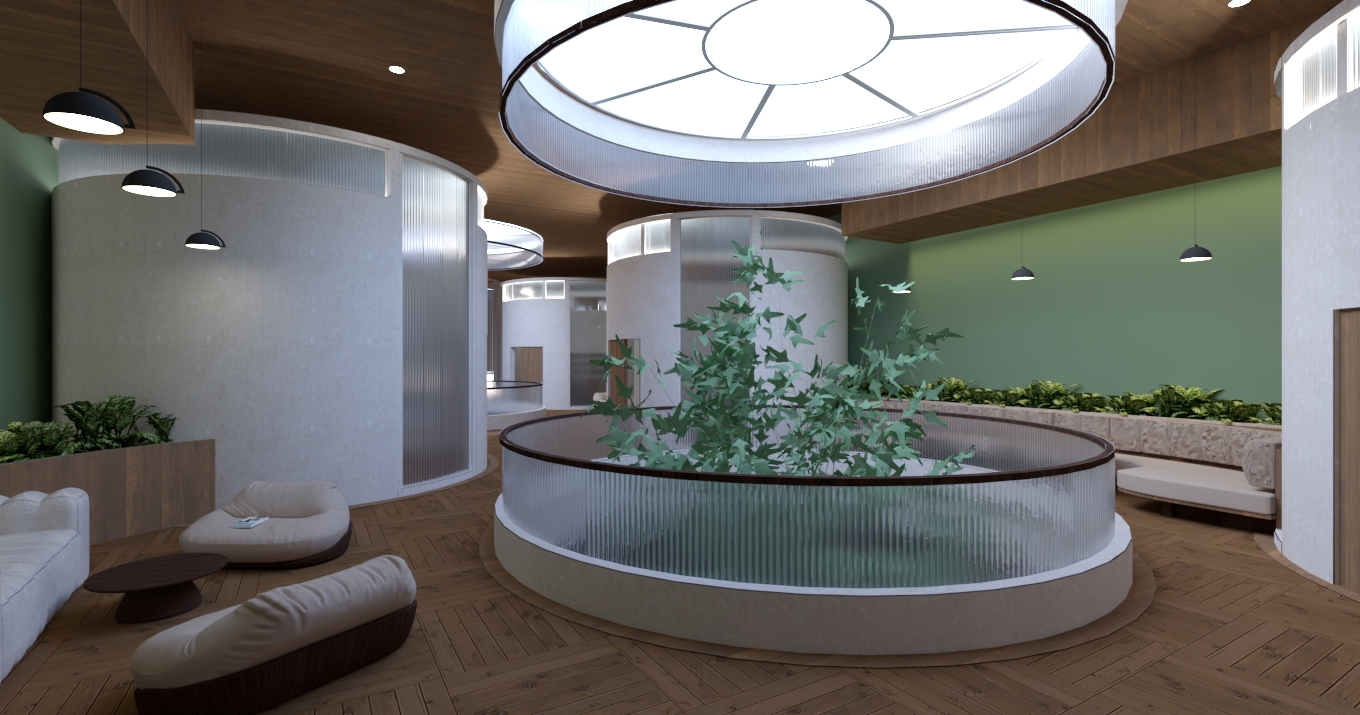 it is a peaceful atmosphere a sunny italian day with sunlight seeping through the skylight and through the leaves of the tree which is in the centre of the bottom glass ring we can only see the top of the trees leaves and branches as the tree actually starts a few floors down dont alter objects or change materials the space cant be too dark as it needs to be accessible the long seating area on the right is the same fabric material as the small chairs on the left making the one on the right equally as smooth and soft