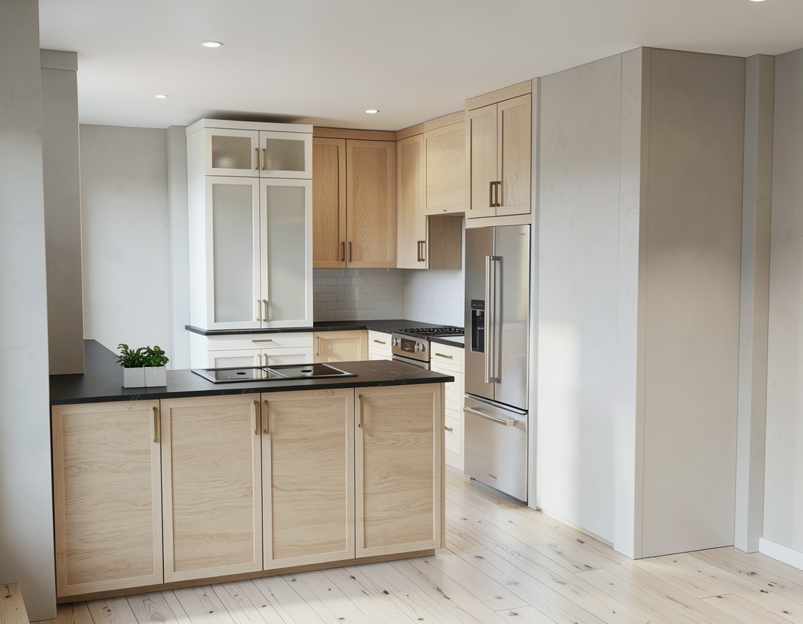 make this render better more accurate materials and soft artificial lighting from the ceiling cabinets are made of stainless steel