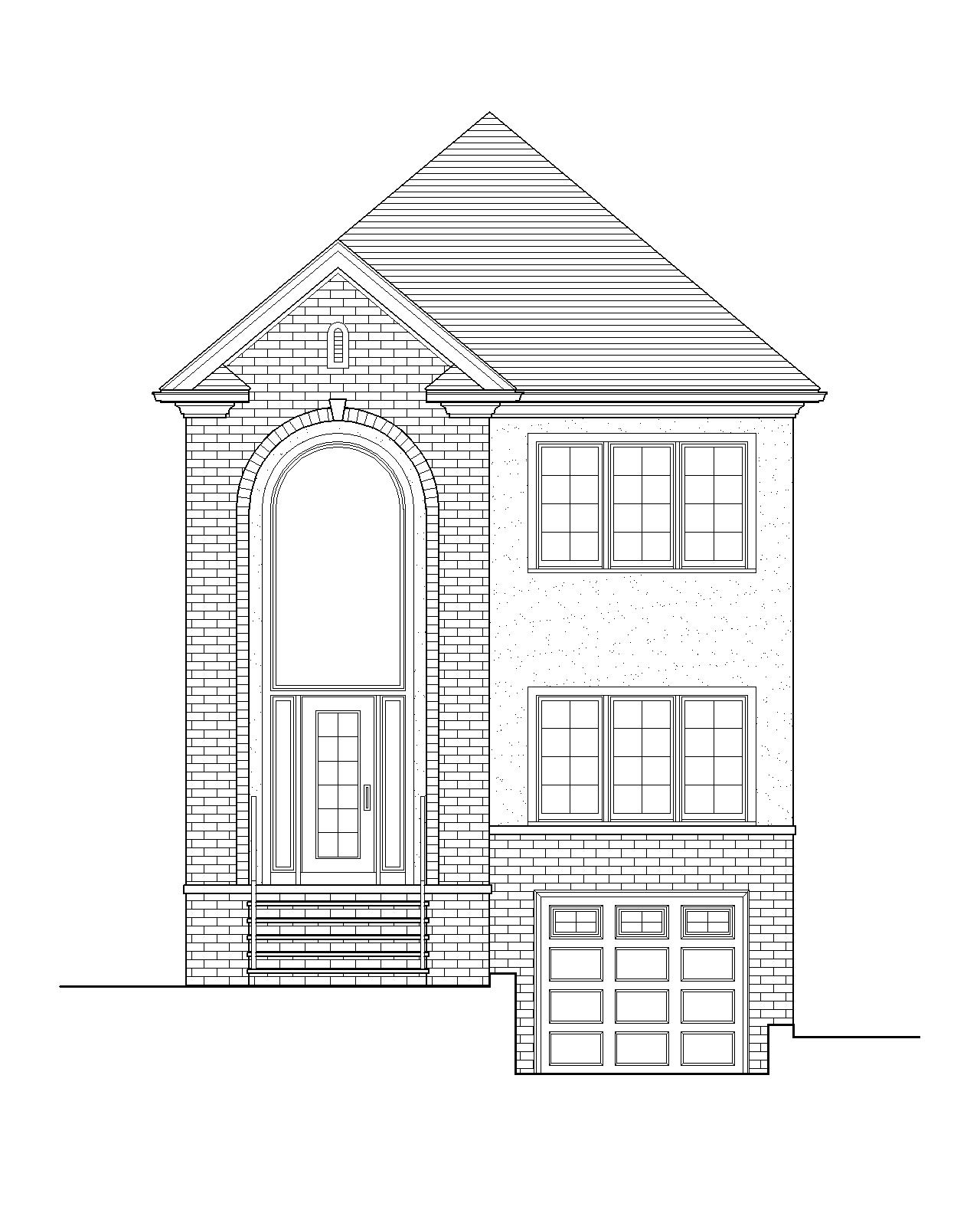 render this elevation realistic in a setting with some landscaping in a residential neighborhood the windows and doors should be black framed the brick should be a modern darkish color and stucco should be in a light modern color