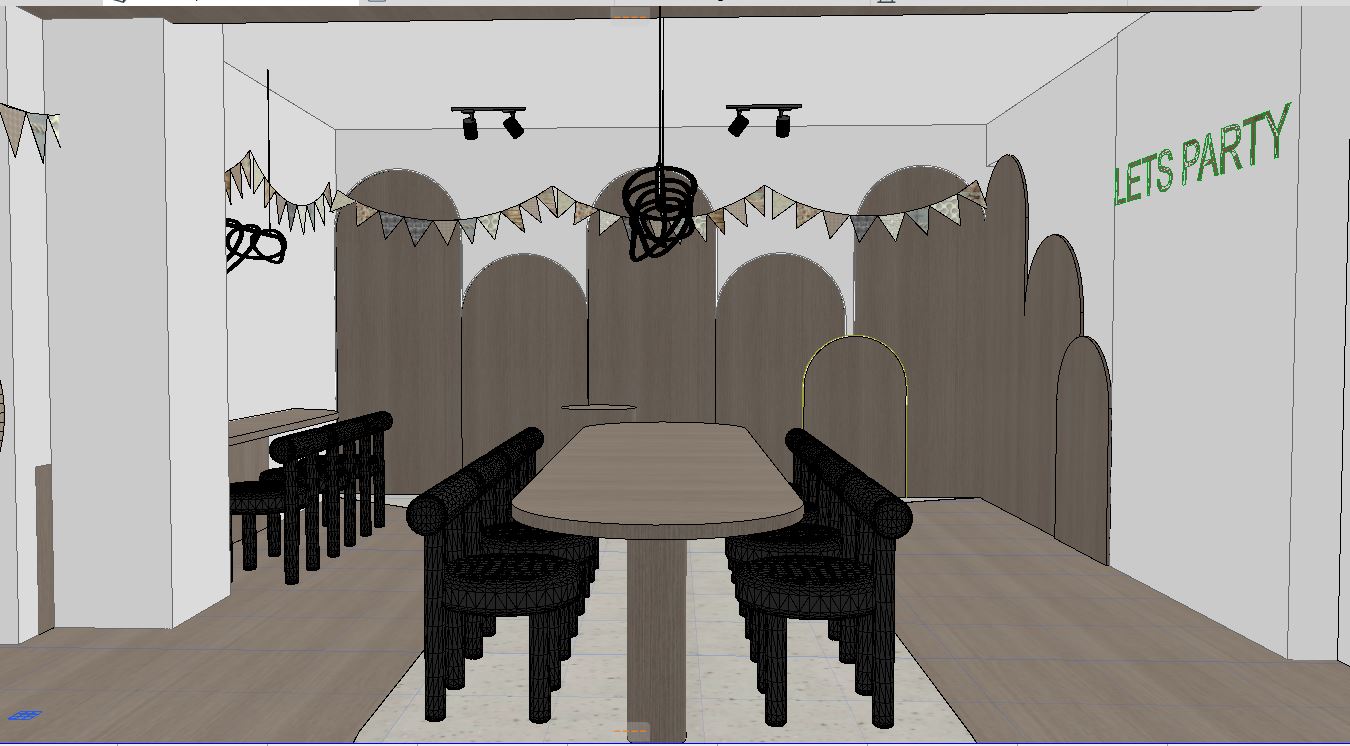 render the existing interior space exactly as it is do not change architecture layout furniture textures walls ceiling floors or materials keep all original objects and textures intact add minimal birthday decoration only elegant balloon arrangement in beige cream soft sage plus a few pastel balloons in light pink soft blue and mint organic balloon arch with varying sizes transparent helium balloons with subtle gold confetti modern matte white let s party sign on the right side of the sign add a subtle aesthetic wall feature soft beige tones minimal playful pattern stars clouds abstract shapes matching the existing wooden scandinavian interior fill the table with fully abundant playful decorations multiple detailed birthday cakes cupcakes with pastel frosting colorful sweets and candies in jars mini cookies tiny gift boxes party hats small vases with dried flowers decorative trays all carefully arranged to look joyful abundant and photogenic maintain original lighting shadows camera angle and all textures add editorial hyperrealistic styling soft volumetric light rays cinematic soft shadows subtle floor reflections depth of field realistic fabric and material details global illumination ray tracing physically based rendering pbr 35mm real camera lens high dynamic range natural color grading ultra detailed textures 8k resolution magazine style interior photography joyful playful atmosphere perfect for children s birthday party