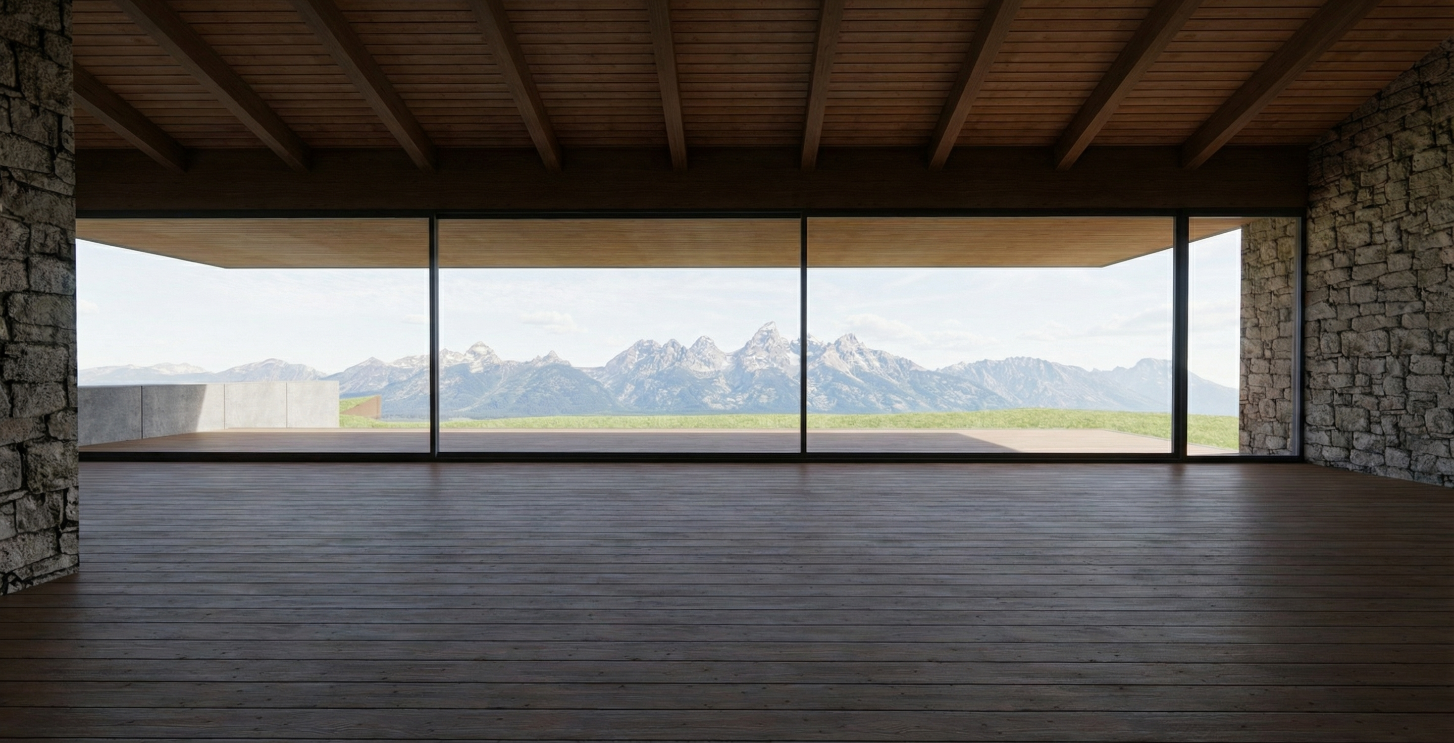 dining table setup a few small chairs near the window a bench near the fireplace smaller mountains in the background a few decorative light fixtures the style should be mountain modern