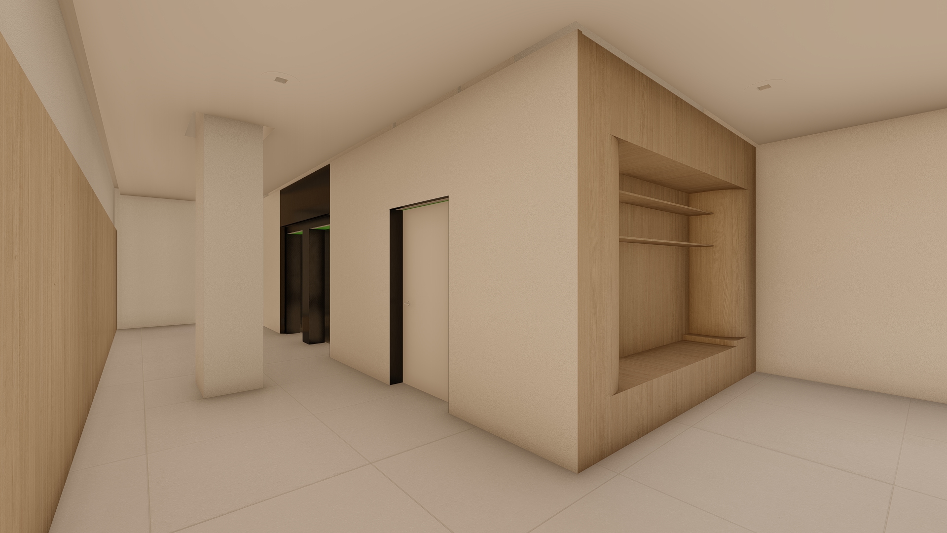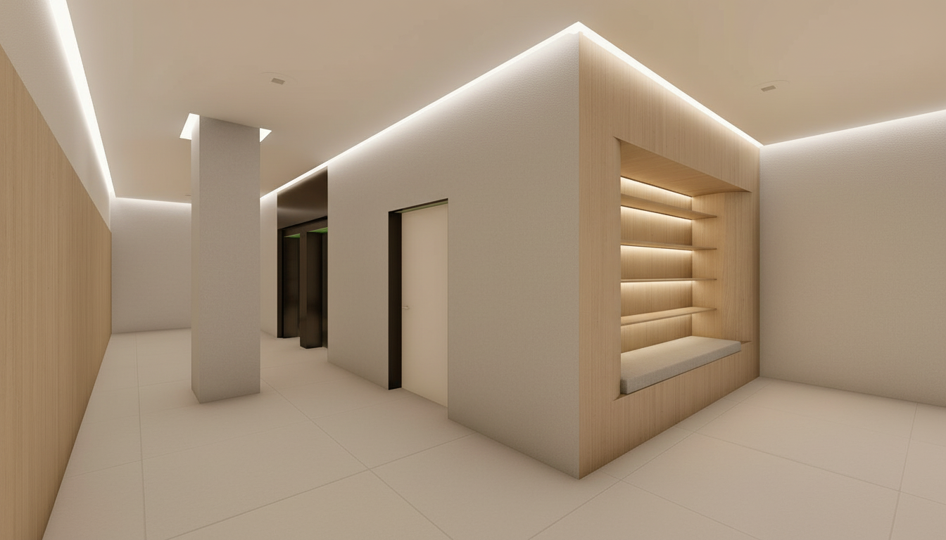 add thin bench upholstered pad add led lights to shelf add cove light to ceiling permiter make wall texture microcement make floor tiles a light travtertine texture