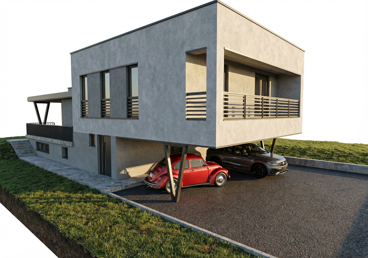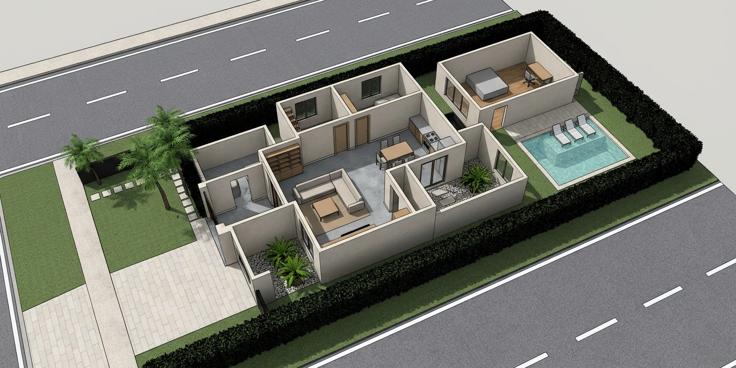 replace the orange tile with a modern mosaic tree pattern with green tones add blossoming lotus and koi fish to the water feature add people to the scene add a few birds in the sky and a humming bird in the foreground with wing blur