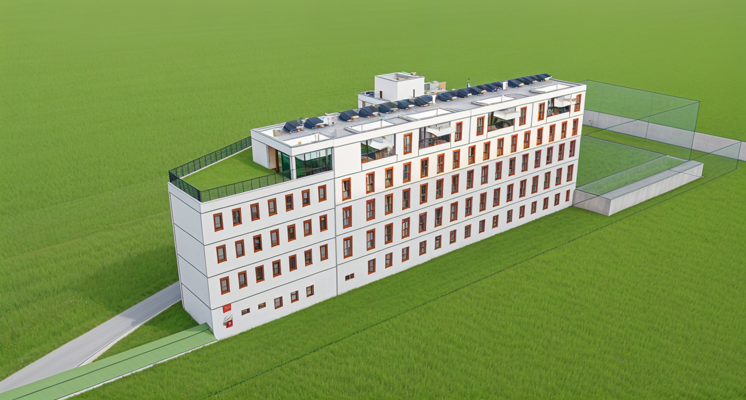 exterior shot a modern minimalist architectural masterpiece featuring clean lines and large glass windows the facade combines light gray concrete panels with dark gray accents creating a striking contrast the entrance is emphasized by a grand dark wooden door and light stone steps surrounding the structure lush green grass adds vibrancy the scene is set against a clear blue sky with soft fluffy clouds emanating a serene and sophisticated atmosphere