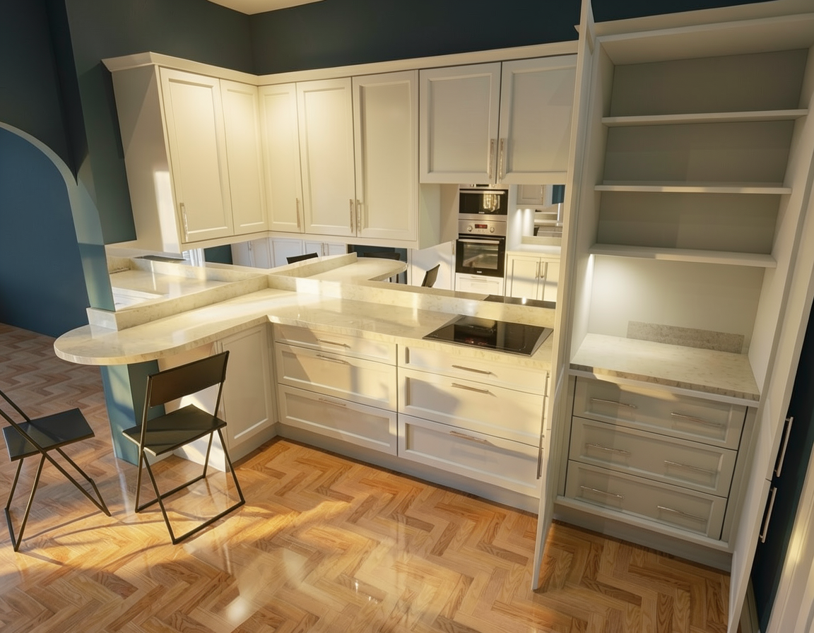 turn this floorplan into a 3d render with soft brown oak floors and vertical tounge and groove wide plank walls painted white beaded inset cabinets painted soft beige the room labeled other 3 is a custom closet with floor to ceiling hanging clothes and a stackable washer and dryer