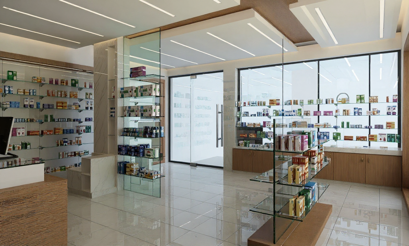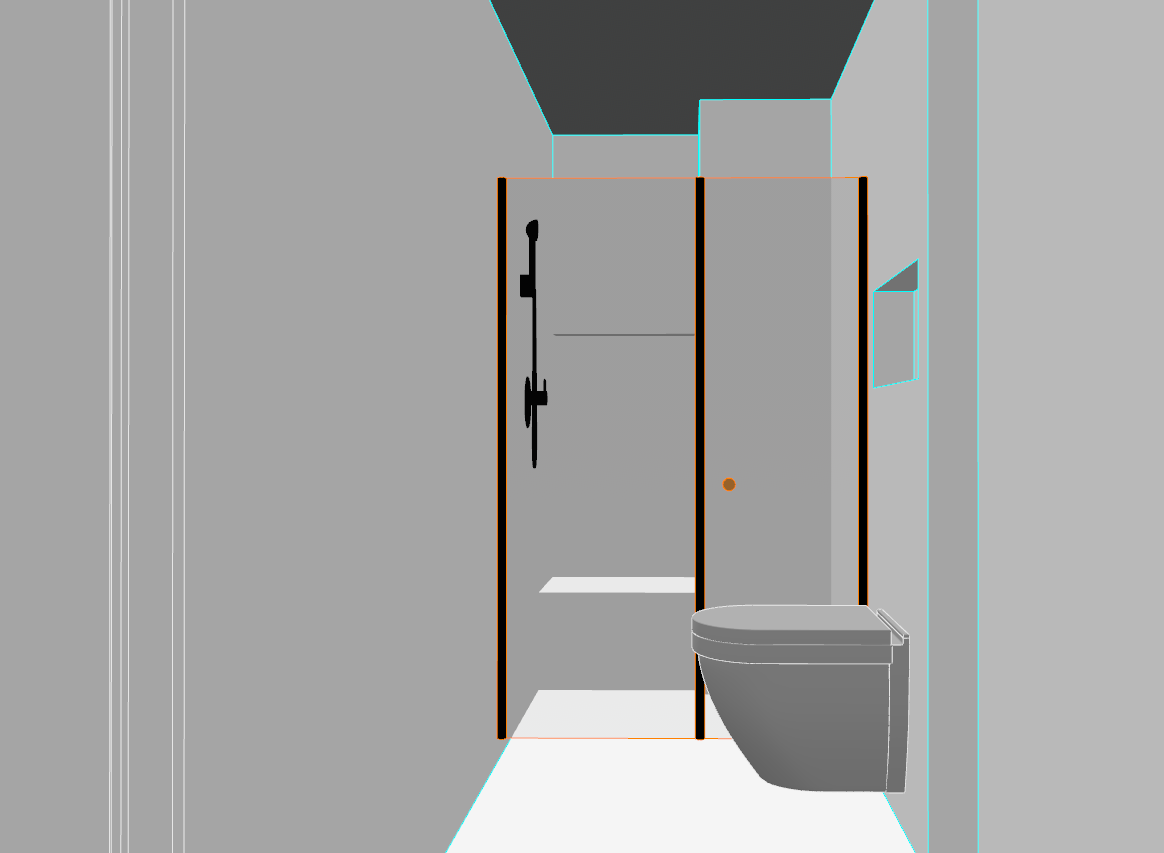 the walls floors and countertops are beige marble leds in the niches and under the mirrored cabinet the ceiling is white and there are 4 spotlights on the ceiling the shower cabin is bright transparent glass