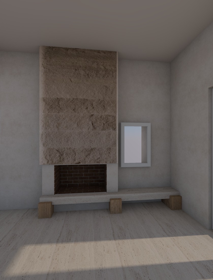 create a highly realistic render of a bedroom with a calm and serene atmosphere the lighting is soft and natural creating a peaceful and balanced mood with minimal shadows above the fireplace there is a raw stone in an irregular organic shape extending across the wall as a design feature the stone appears natural and unrefined adding texture and visual interest the wall is finished in a very light beige polished microcement creating a smooth and minimal background that enhances the natural materials ultra realistic render high resolution interior design magazine photography style