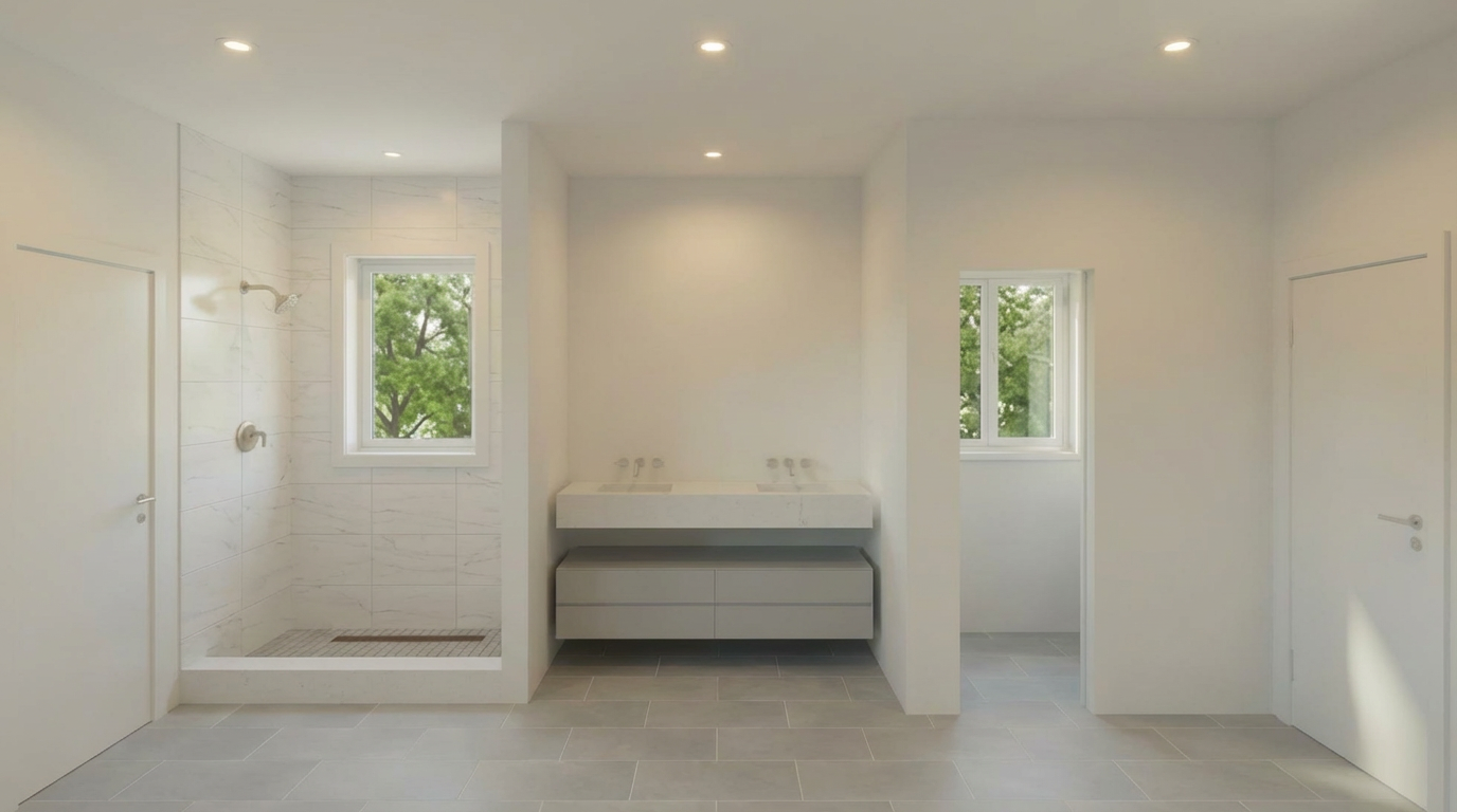 keep everything exactly the same in the rendering do not change the layout walls windows doors vanity fixtures shower walls or main floor tile only modify the bathroom floor to a lighter gray