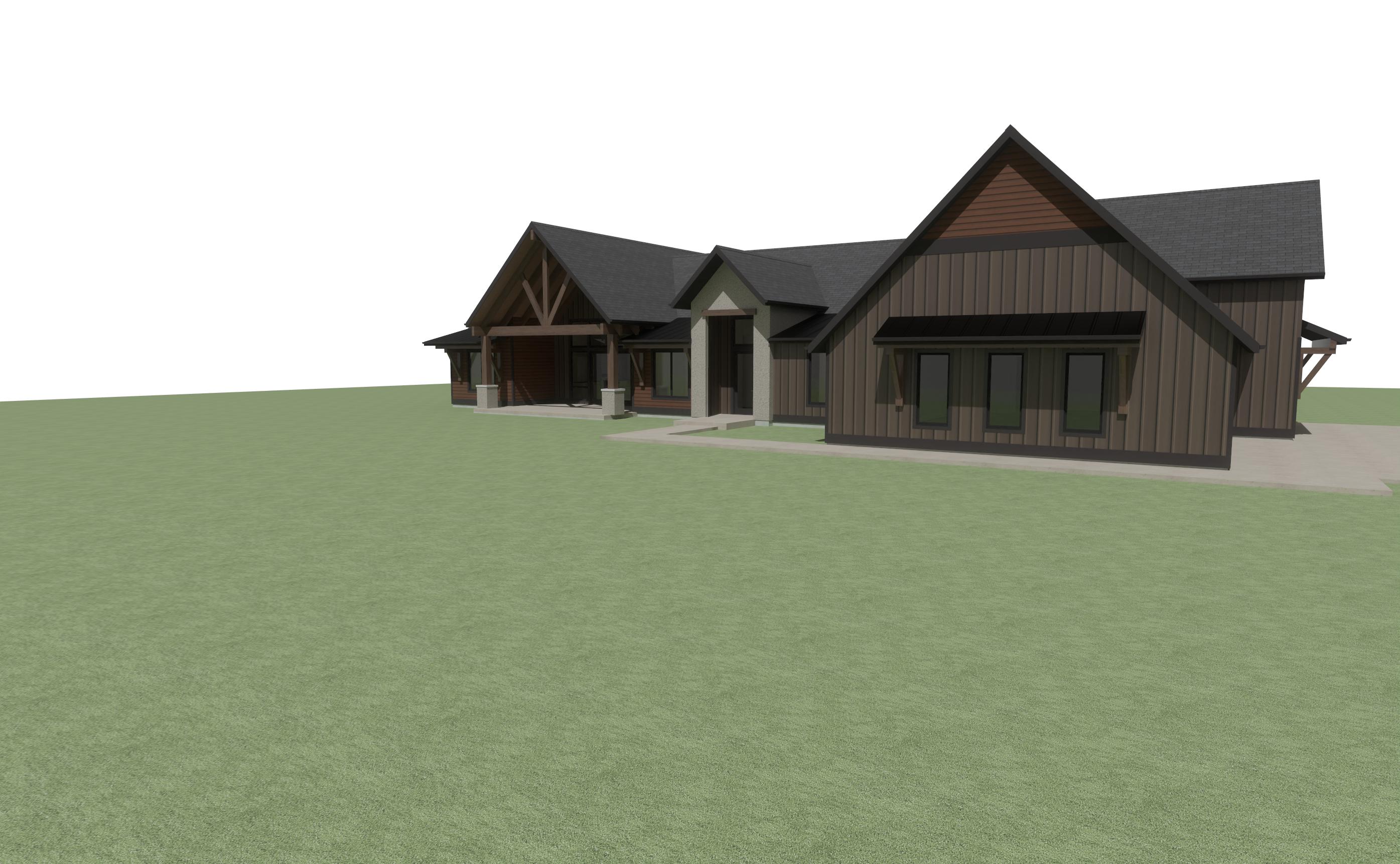 enhance the realism of the existing architectural design while maintaining the same materials and textures focus on realistic lighting shadows and surface details to create a lifelike appearance ensure the mixture of wood siding is preserved in the correct areas making them look authentic and cohesive so keep the horizontal siding and vertical siding the same as reference photo but change texture and color this is in montana add montana landscape but nice landscaping near the house add montana vegetation around house make horizontal siding canyon by diamond kote make all trim around doors and windows trim at bottom of house and fascia diamond kote onyx color make board and batten diamond kote color coffee make all wood stain sherwin williams charwood make rock like a stacked mountain modern style rock make nice landscaping in foreground do not change the rocks on walls only do rock on the skinny tall entrance that i have shown do not add chimney