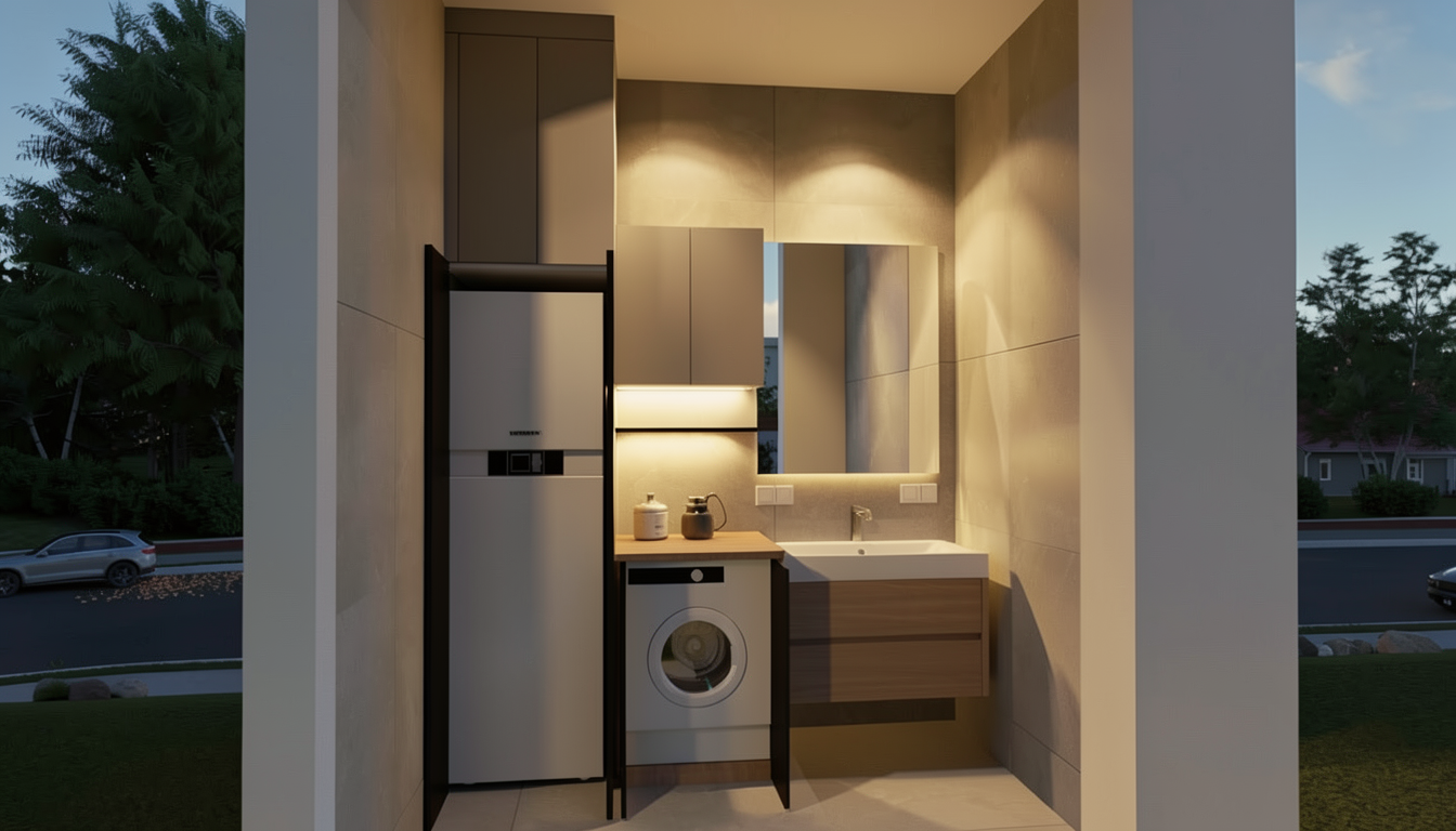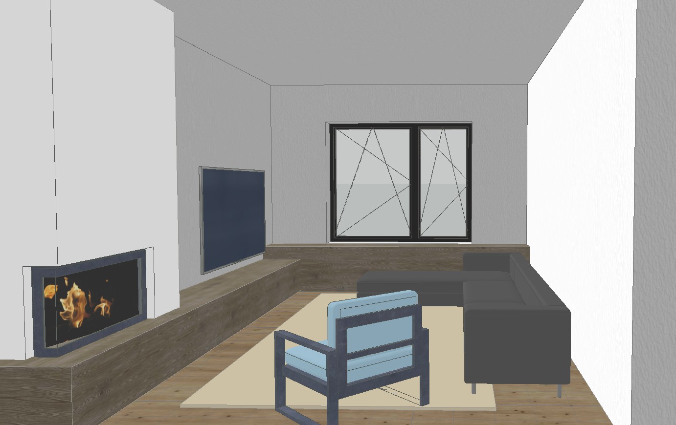create a modern living room with a cozy and inviting atmosphere walls are bright white to enhance natural light the cabinets are a light oak wood accents for warmth the countertops are sleek white marble with subtle gray veining the floor is a light natural oak pattern the faucet and details are matte black for contrast fireplace with light fire rug is luxurious furnitures are skandiavian and modern