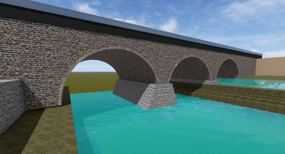 a classic stone bridge with three arches spans across a river the bridge is built with textured brownish gray cobblestones creating a rustic appearance beneath the left arch there is concrete on the left a stone wall leads up to the bridge matching its stony texture the riverbanks are covered in verdant green grass suggesting a peaceful natural setting the lighting is soft and warm reminiscent of a sunny morning the sky transitions from a deep azure at the top to a lighter blue near the horizon enriching the tranquil and harmonious atmosphere architecture