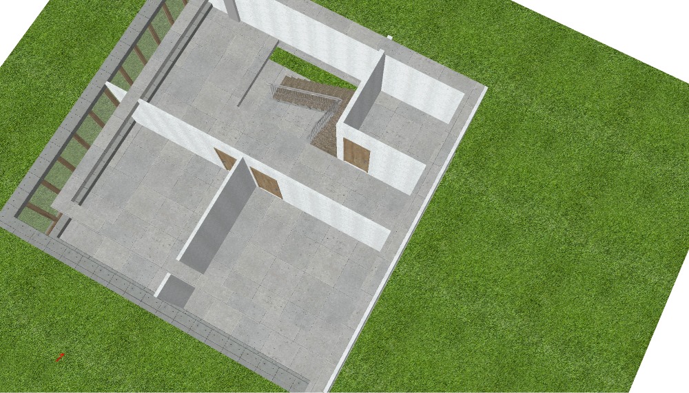 a modern minimalist two story building with large glass windows on both levels framed with light oak wood the exterior walls are smooth white concrete the roof and floor edges are finished with a sleek light gray concrete surrounded by a lush vibrant green lawn under a clear blue sky with soft warm sunlight casting gentle shadows creating a serene and peaceful atmosphere