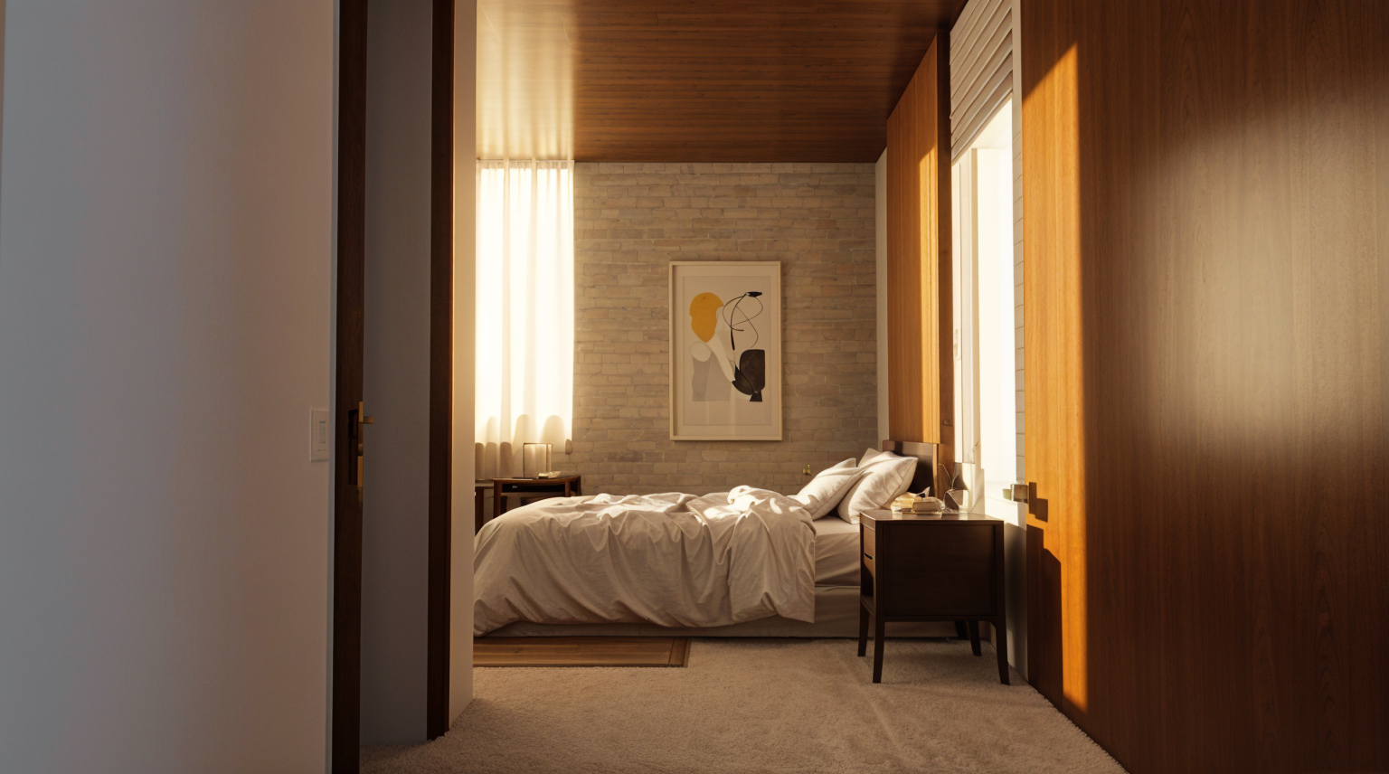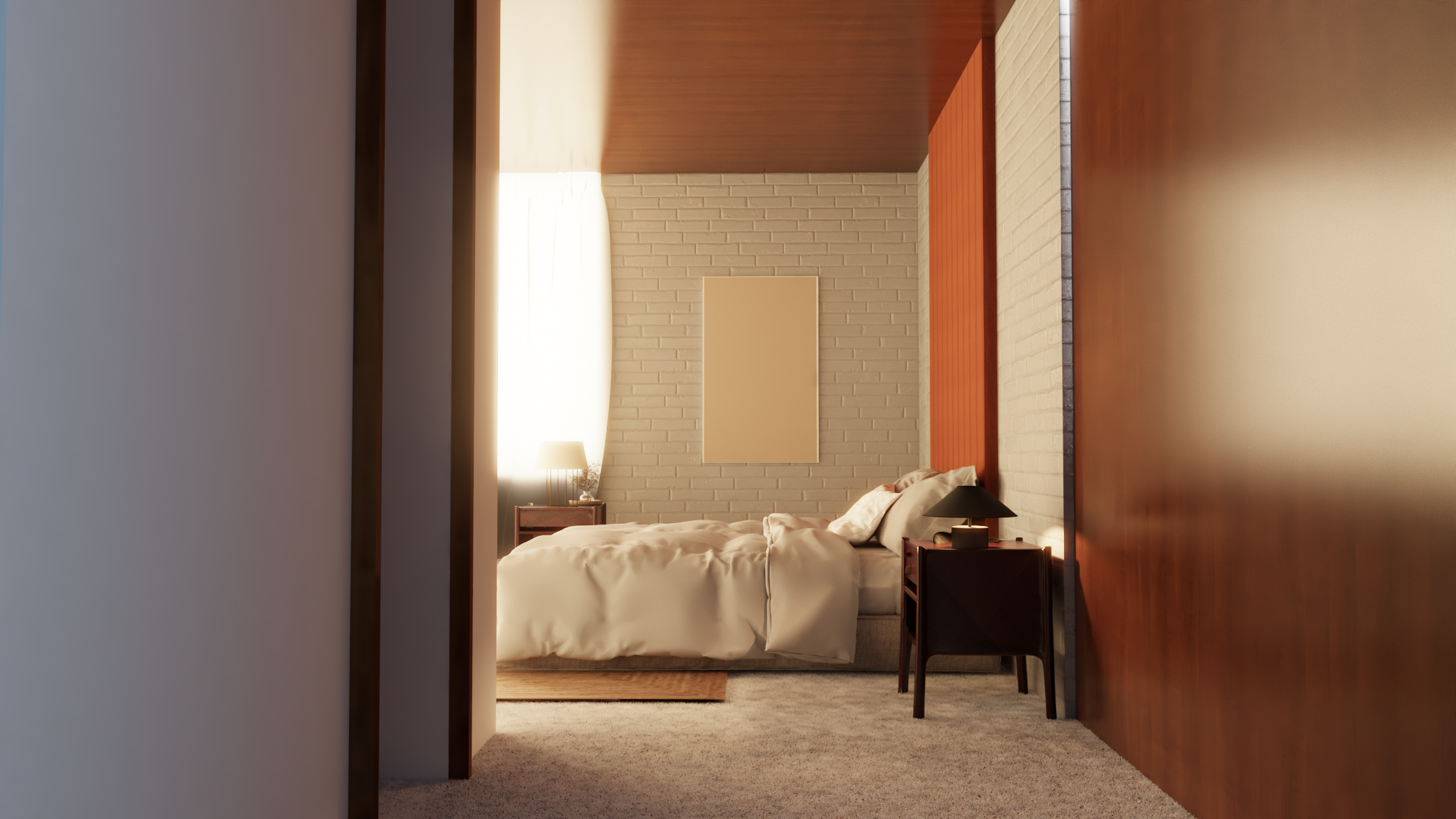 improve the quality of the materials and create a ray of light during the golden hour put a minimalist image in the background frame you could place a small table in front of the white wall with a vase with branches en los buros van lamparas de noche encendidas con luz calida