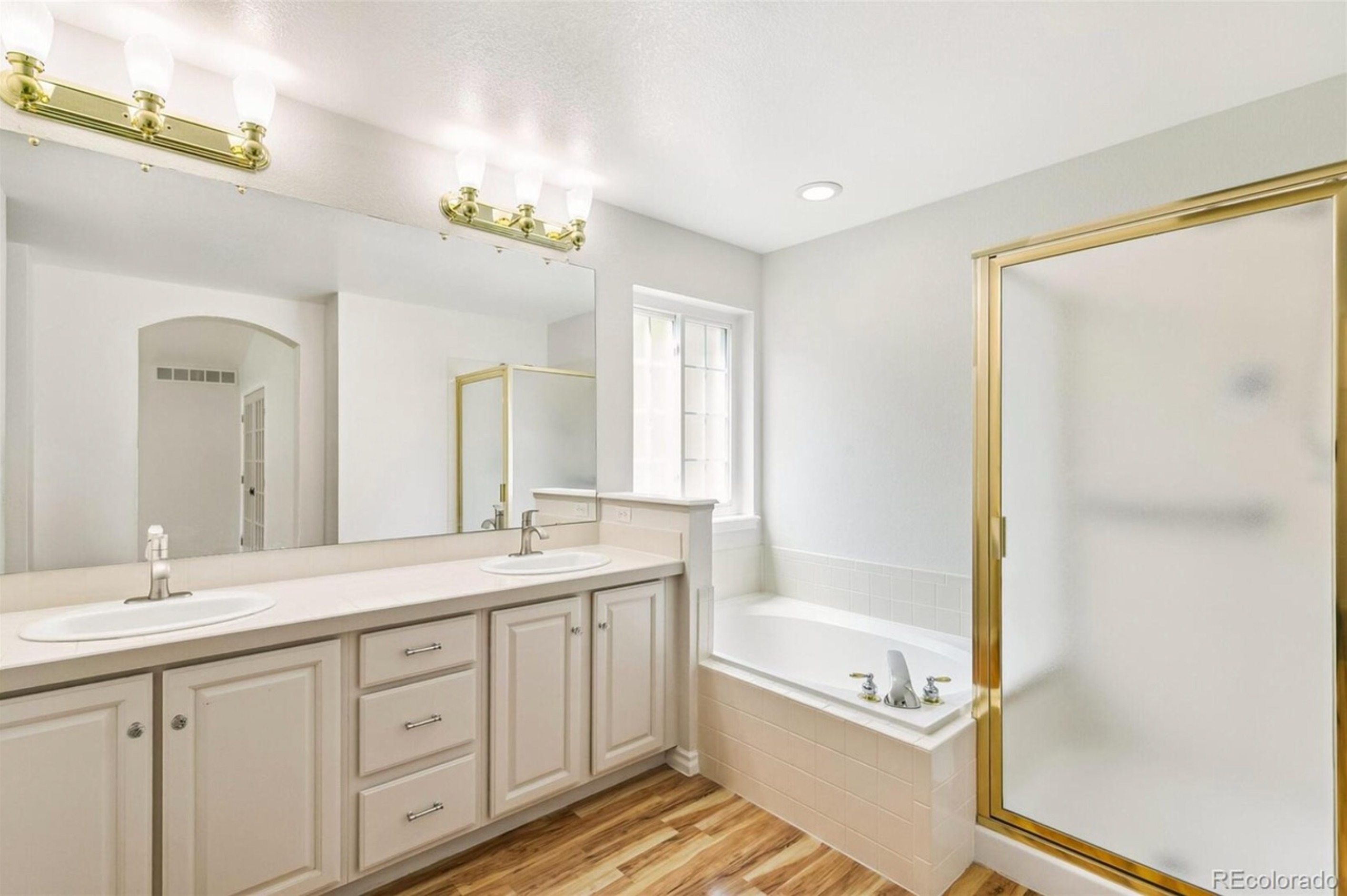 add a modern glass shower enclosure with modern tile to the ceiling replace the bathtub with a free standing tub modernize the vanity mirrors lighting