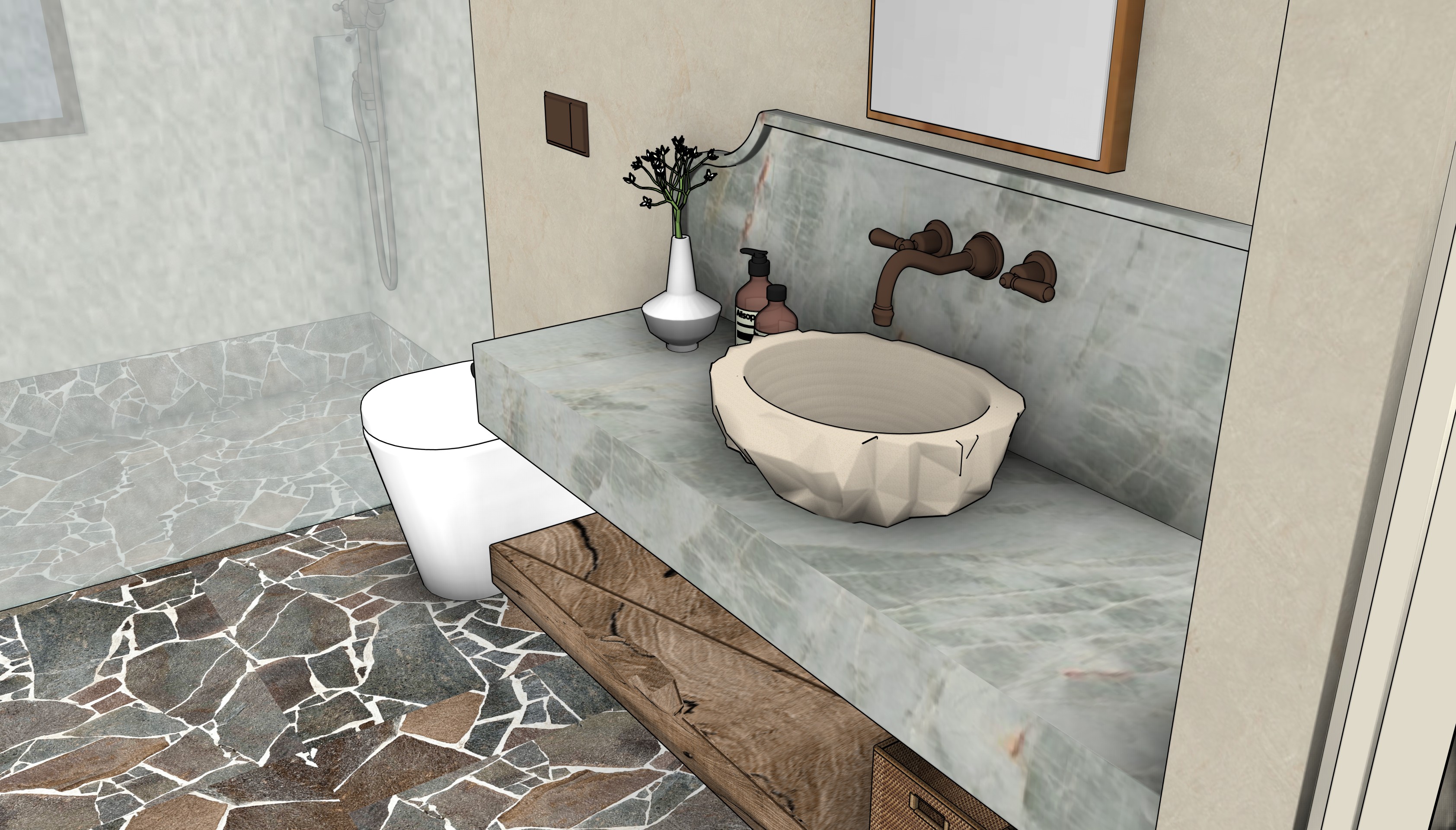 the green stone vanity is a muted emerald quartzite not a bright or deep colour the frame of the mirror is rope