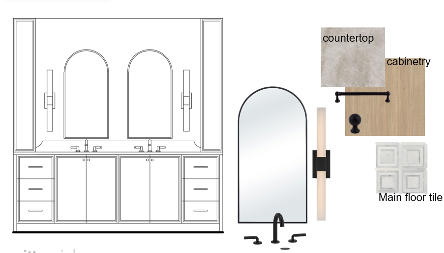 modern zen primary ensuite floor tile is marble 12x12 moscaic all fixtures are black white walls are painted benjamin moore simply white cabinetry is wood chip as well as the columns that go to ceiling countertop is taj mahal chip