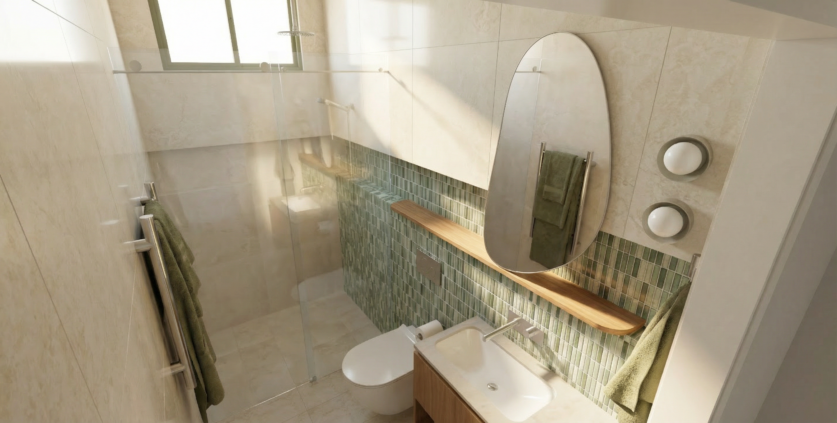 evening view lights on inside the house add california wild grasses and flowers to the landscape add grass in the the yard space enhance the glazing materials add some palms and trees adjacent to the house on the left and right sides of the view add some lights in the planting areas use the perspective view from the source image add a woman walking a golden doodle on the sidewalk add a man and girl waling towards the front entry door don t change the camera angle of the source image add a woman sitting in the eames lounge chair in the bedroom above the garage