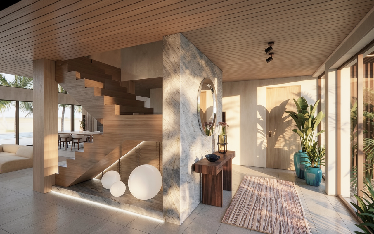 please replace the facade with modern wood grain panels in a dark walnut color but they should be installed vertically narrow facade panels should cover the entire exterior of the house a minimalist elegant style with realistic lighting and wood grain