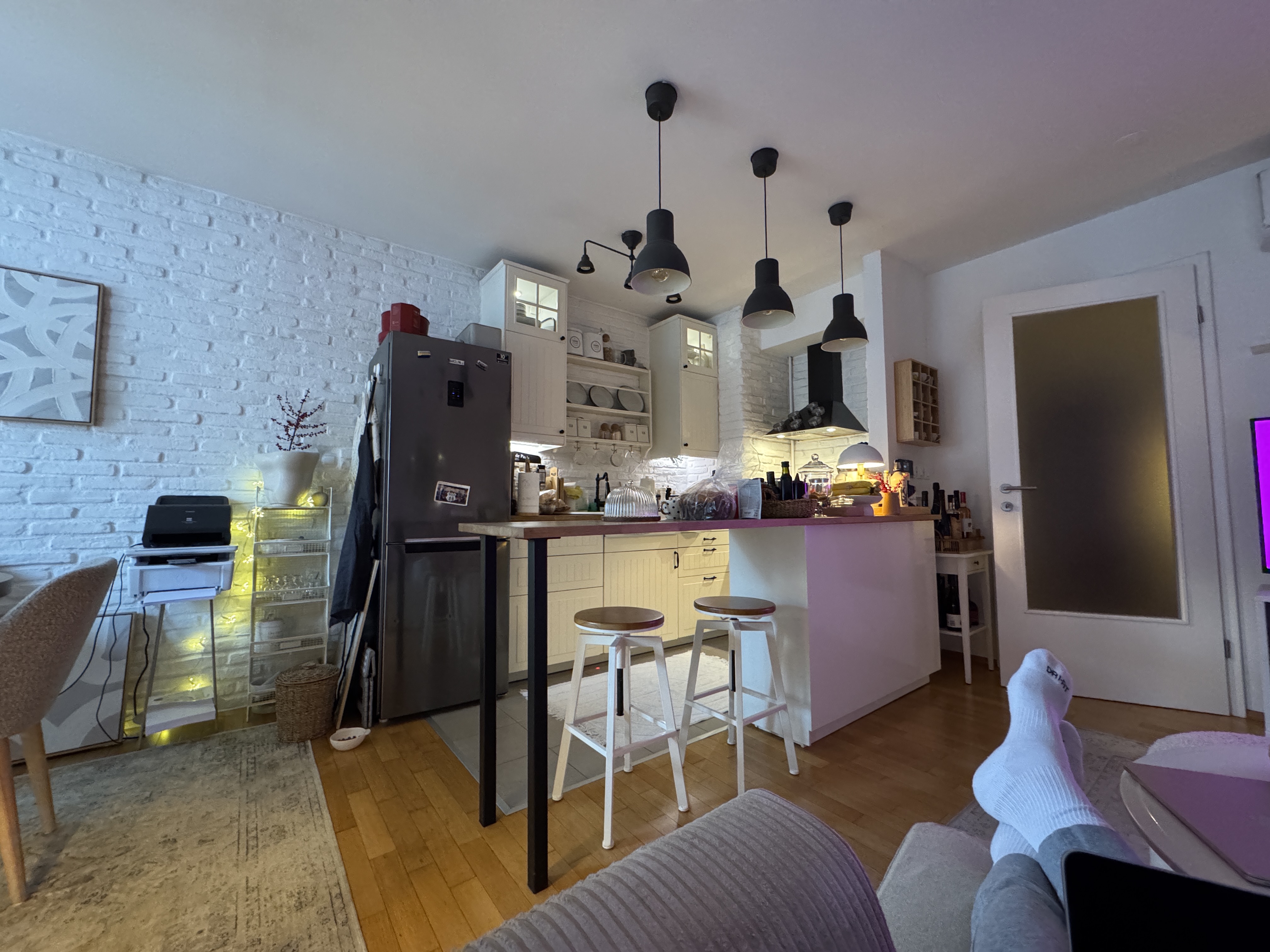 interior renovation of an open plan living room with kitchen preserve the exact geometry of the space including all wall positions door locations window openings ceiling height and camera perspective do not move remove or add any doors walls or windows keep the layout exactly as in the original image redesign only materials furniture lighting and finishes style modern minimalist interior warm and elegant high end residential design color palette soft neutrals warm beige ivory light taupe subtle contrast with black details living room replace sofa with a modern clean lined beige fabric sofa add a minimal coffee table reduce clutter add subtle decor replace tv wall with a clean built in minimalist unit in warm neutral tones keep styling simple and refined kitchen upgrade kitchen to modern minimalist style with flat panel cabinets in matte light beige or soft taupe integrated appliances clean lines replace countertop with light quartz or stone keep kitchen layout unchanged materials light oak flooring throughout soft textured fabrics subtle stone or microcement accents matte finishes no gloss lighting soft natural daylight warm indirect ambient lighting minimal modern ceiling lights realistic shadows mood calm refined premium uncluttered realistic and livable photorealistic high detail accurate proportions straight vertical lines realistic materials negative prompt do not change layout do not move doors do not move walls do not change window positions no new openings no distortion no exaggerated luxury no unrealistic furniture no clutter no color overload