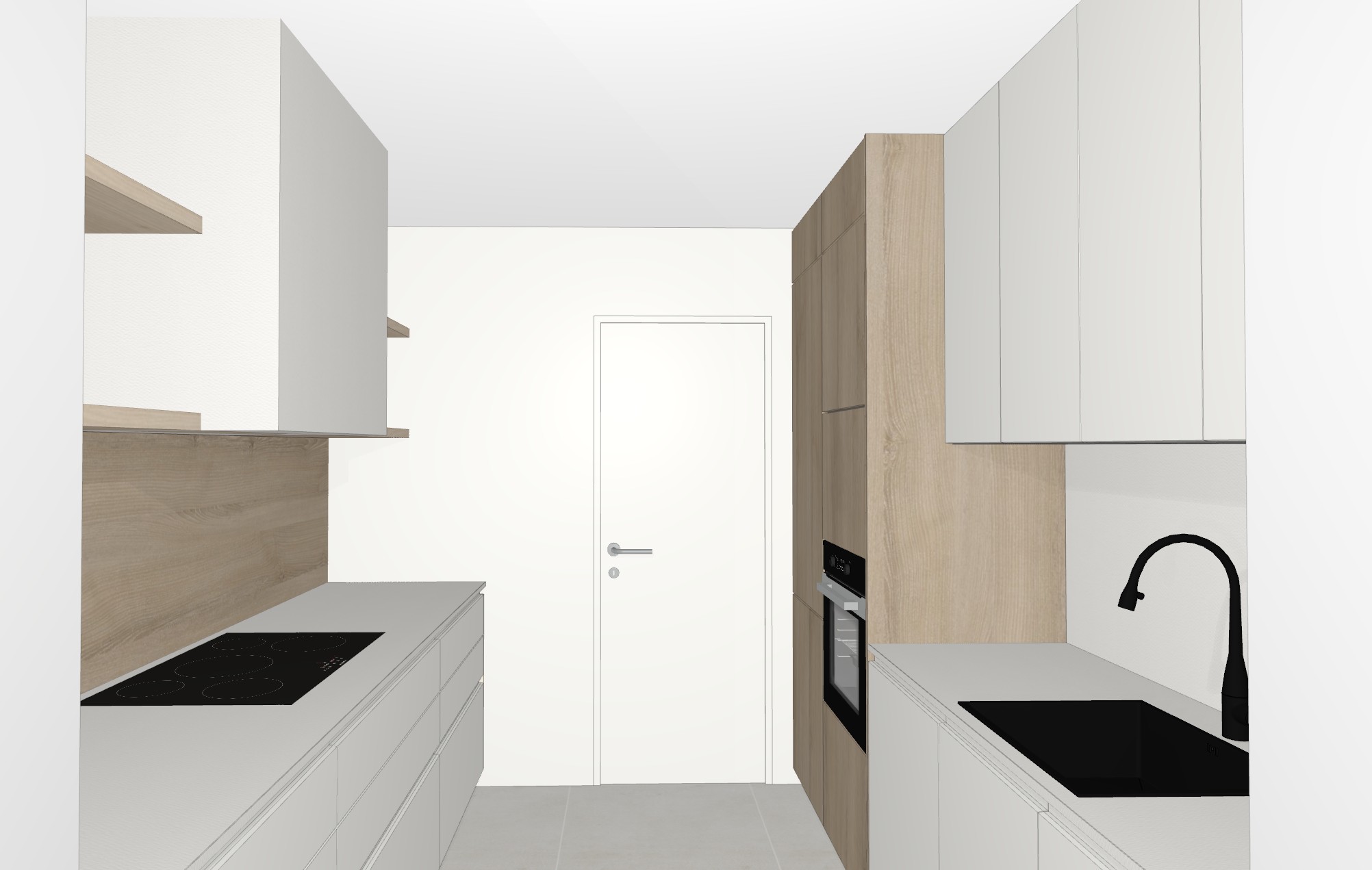 render a modern minimalist kitchen with a soothing atmosphere use warm white for the cabinets incorporating light wood textures for warmth the countertop should be a sleek light gray with a subtle shine the floor tiles should be a soft gray complementing the countertops incorporate a matte black finish for the faucet and stovetop for a touch of contrast use white for the walls and ceiling to maintain an airy feel the oven should have a polished stainless steel finish enhancing the contemporary vibe add natural light to create a warm inviting ambiance