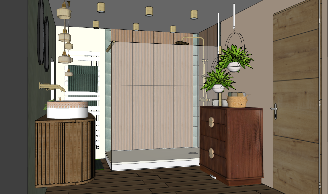 create a modern cozy bathroom space with a focus on natural materials and colors the walls are a calming olive green with a subtle matte finish the ceiling is a soft neutral gray to complement the warm ambiance the floor is rich dark wood with visible grain adding an earthy texture the shower area features sleek light wood panels surrounded by pale blue gray tiles for a fresh and inviting look a round wooden vanity with vertical ribbing supports a white ceramic basin accented with a light pink decorative band brass fixtures and a natural rattan basket add a touch of elegance two white hanging planters with lush green foliage bring life and freshness mood lighting is provided by vintage pendant lamps in warm beige casting a soft inviting glow throughout the room the atmosphere is serene harmonious and sophisticated