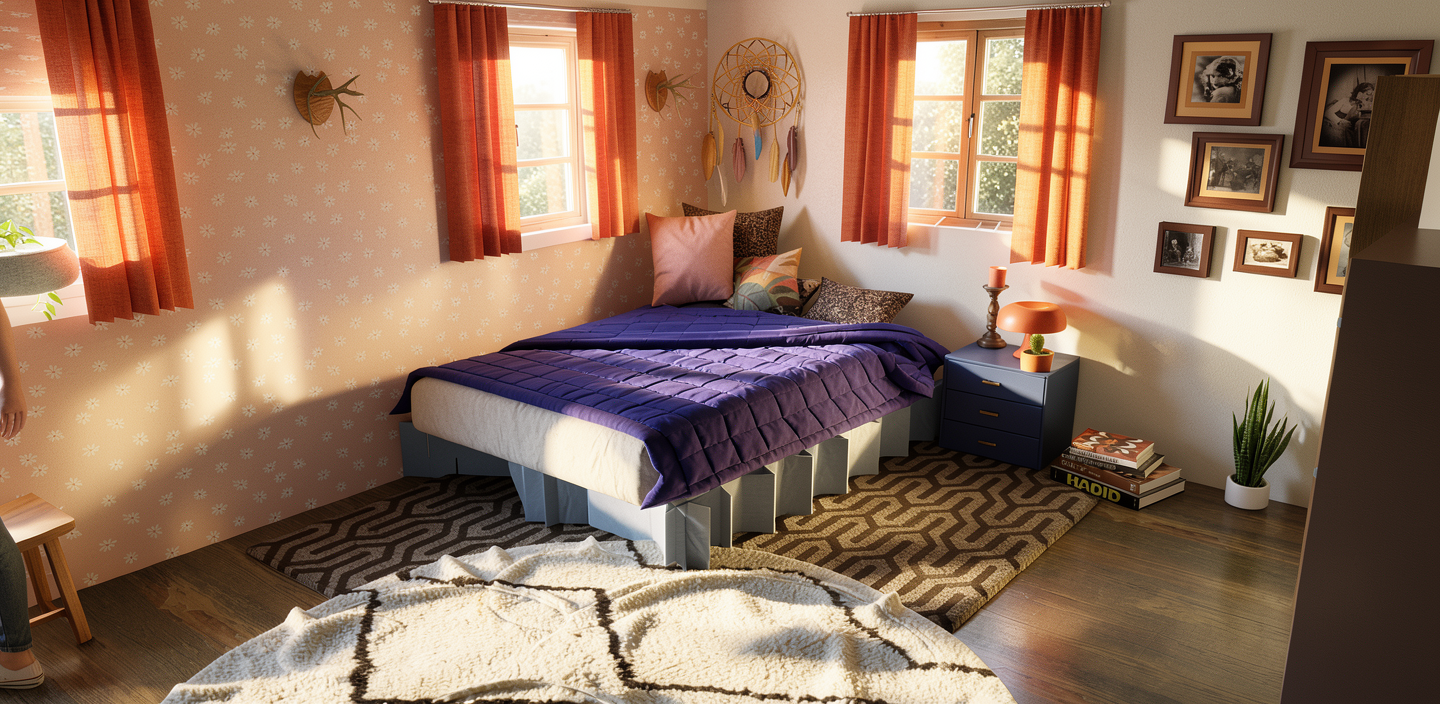 make dirty patina on windows ad deep window sill patina on walls and curtains make floor from rough wood change carpet pattern to an old carpet wallpaper flower wall paper with patina change bed to old wood bed ad clutter