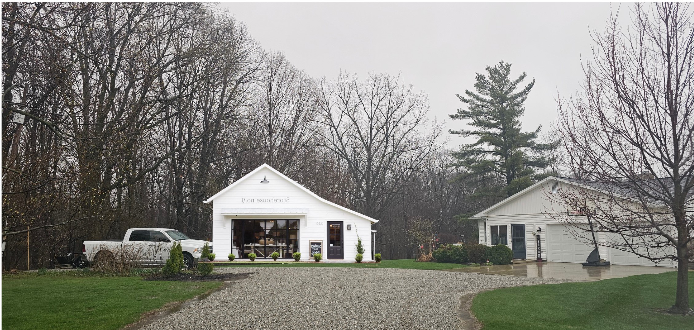 make this a photo of the building sitting on this property remove the lettering above the overhead garage door on the building on the left and also make the overhead garage door a solid white panel garage door