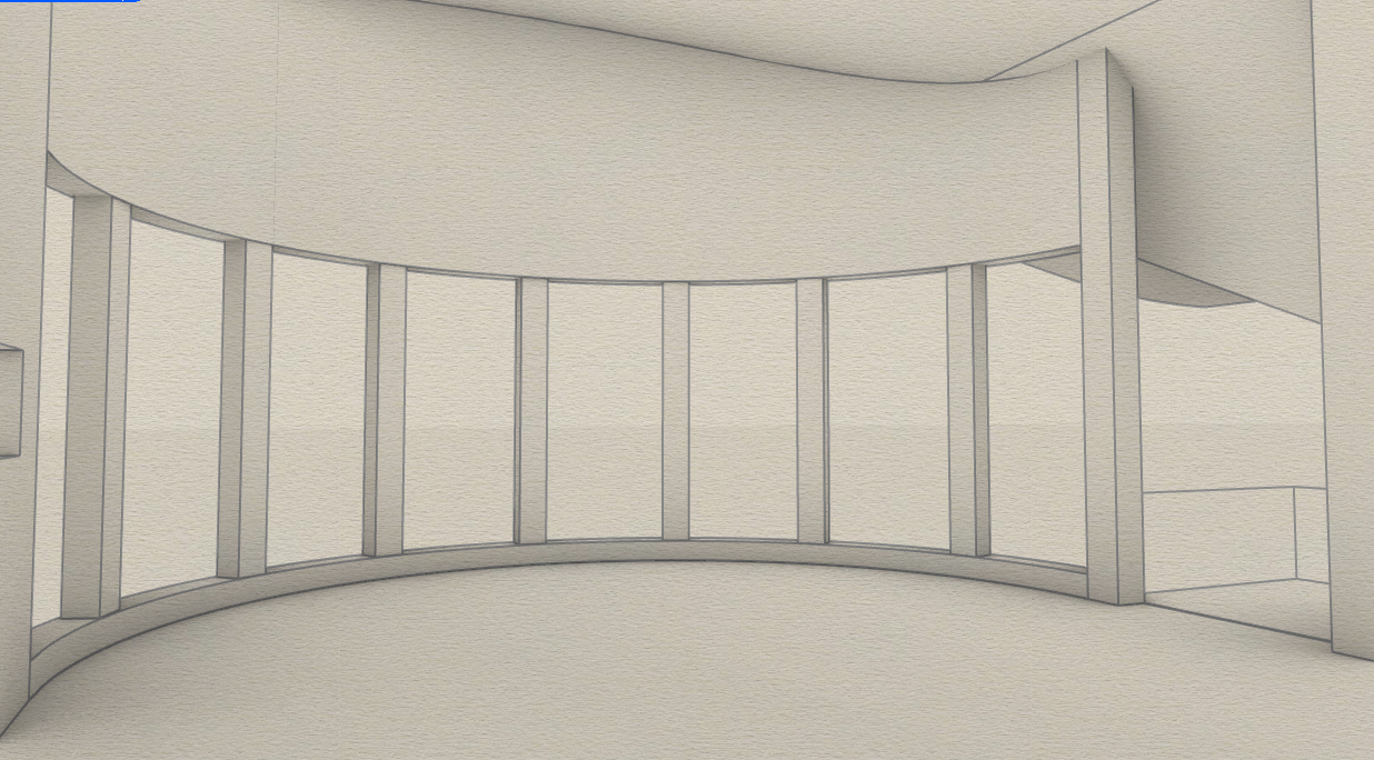 architectural watercolor illustration of the exact interior geometry and camera angle shown in mnt data screenshot 2025 11 18 161502 png do not change the perspective layout curved glazing roof underside or any proportions materials colors updated floor must be rendered as light polished concrete with subtle reflective sheen and soft watercolor shading columns must be black steel defined with dark ink linework and deep watercolor tone window mullions and frames must also be black steel interior walls remain soft matte gray tones with watercolor wash variation strong watercolor style use a highly expressive watercolor aesthetic featuring loose wet on wet washes soft bleeding paint edges visible granulation and paper texture ink pencil linework uneven tonal variations gentle fading to white paper at edges translucent layered washes for depth exterior view through the glazing outside the windows show a soft focus watercolor landscape hazy layered blue mountains dense evergreen forest cloudy bright sky and faint fog drifting through the lower valleys keep it painterly and atmospheric not photo realistic lighting natural diffuse daylight entering through the glass with soft watercolor shadows on the polished concrete floor and gentle reflections