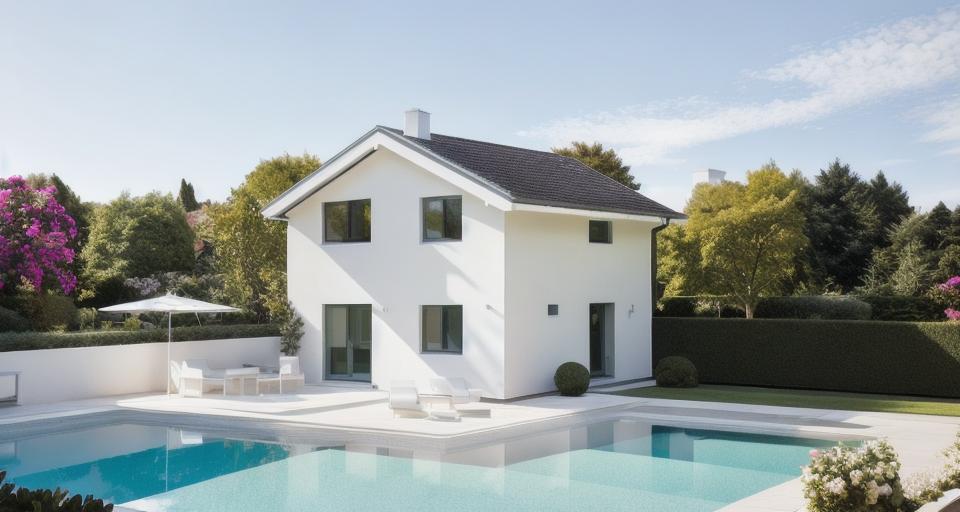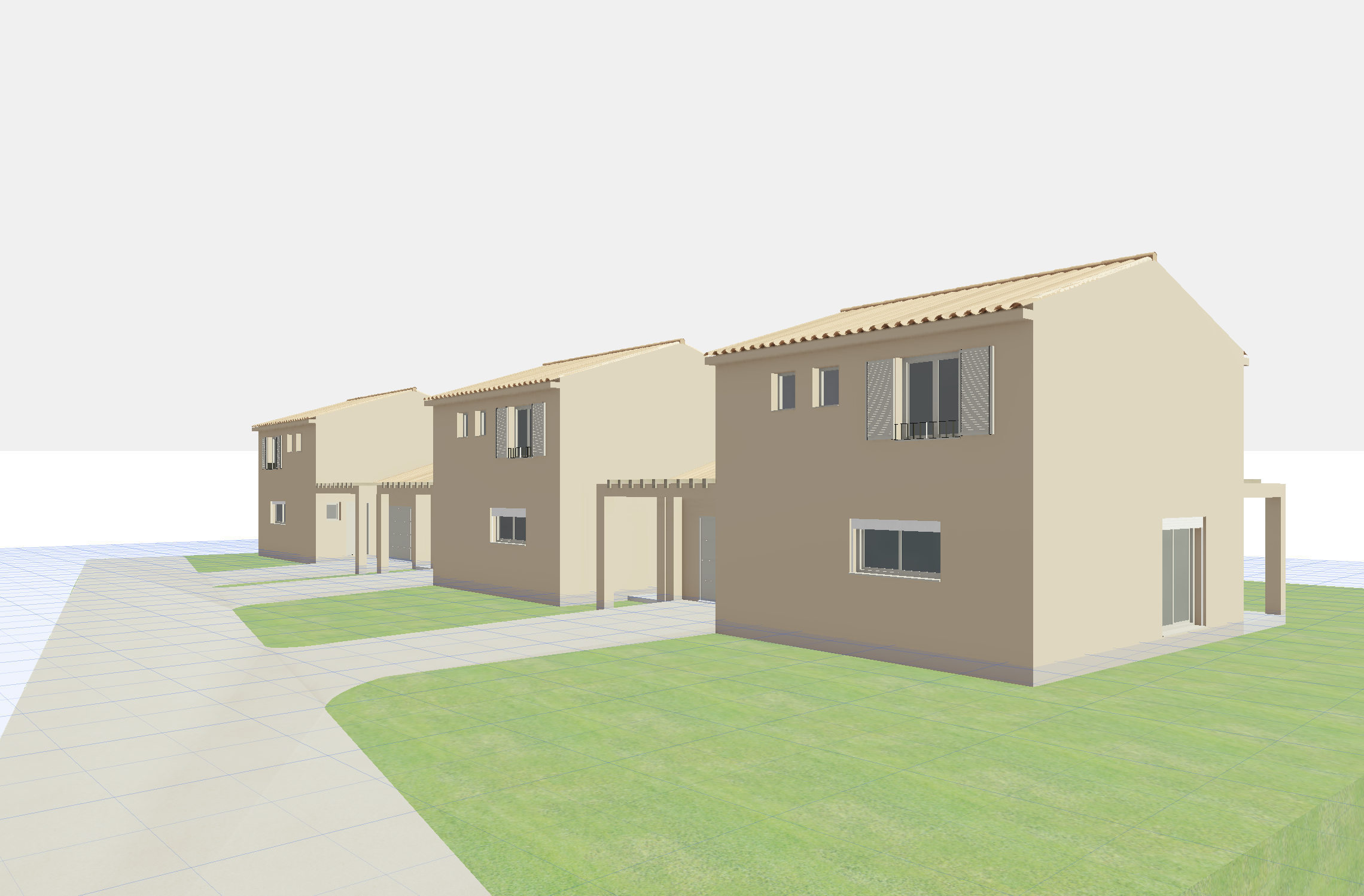 in mediterranean campagne with oak and pine trees in the background and olive trees and laurier rose in the foreground lot of reflects in the windows the driveway is made of beige sand shutters are green gray the houses are new in the foreground there is no plants