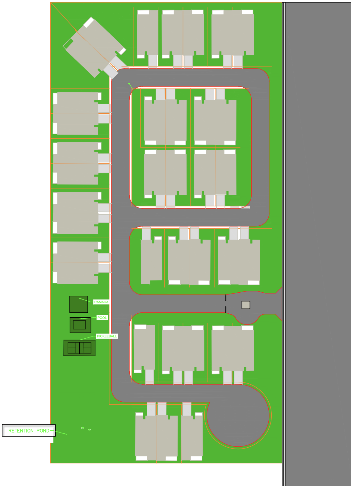 site plan with no text or key landscape where it is green houses represented with grey roof dark gray road ways in the neighborhood on the right side is a man road no median in the road