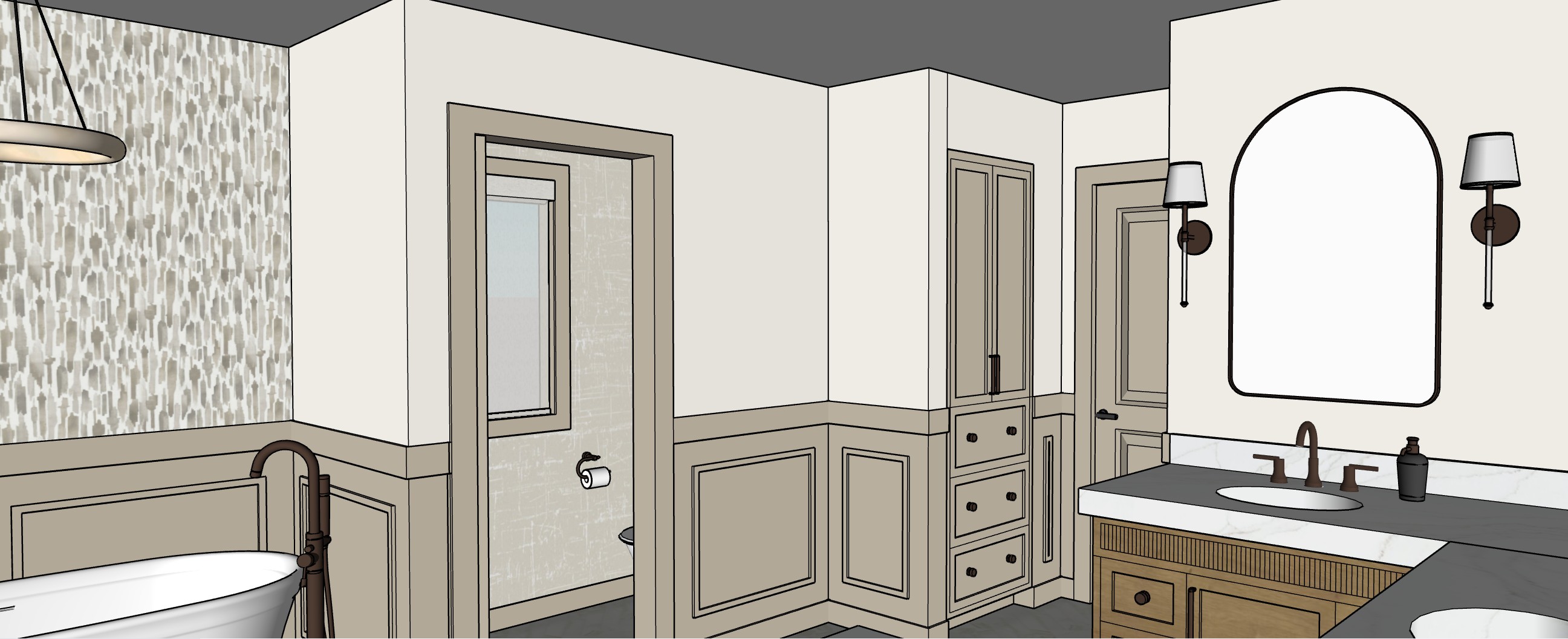 please make this photorealistic the flooring is a 3 x12 polished marble inspired tile laid in a herringbone pattern the chandelier is alabaster and the fixtures are all a champagne bronze only the back wall behind the porcelain white tub has a wallpaper above the molding pluie by york wallcoverings pattern lm5404 the side table by the tub has a marble top wood leg and gold base the windows have a light filtering roller shade do not show any towel bars on the walls the shower tile is a soft white the countertops are a white quartz with soft and subtle beige veining the doors and casing are the same color as the lower half of the molding which is pashmina by benjamin moore add some background behind the windows and roller shades add soft natural lighting and shadows the vanity is white oak with a reeded fluted detail at the top the countertop is 3 thick
