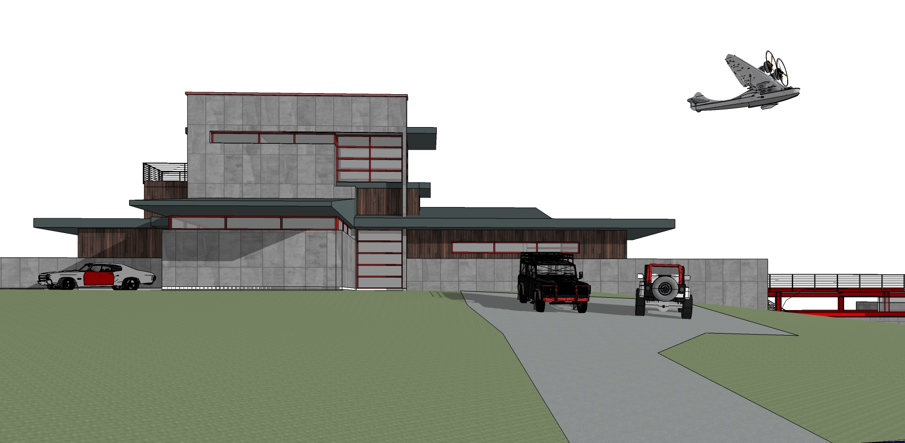 dynamic building lighting corten steel and concrete panels tall grass foreground raining
